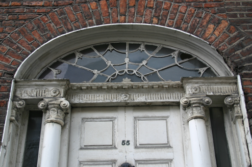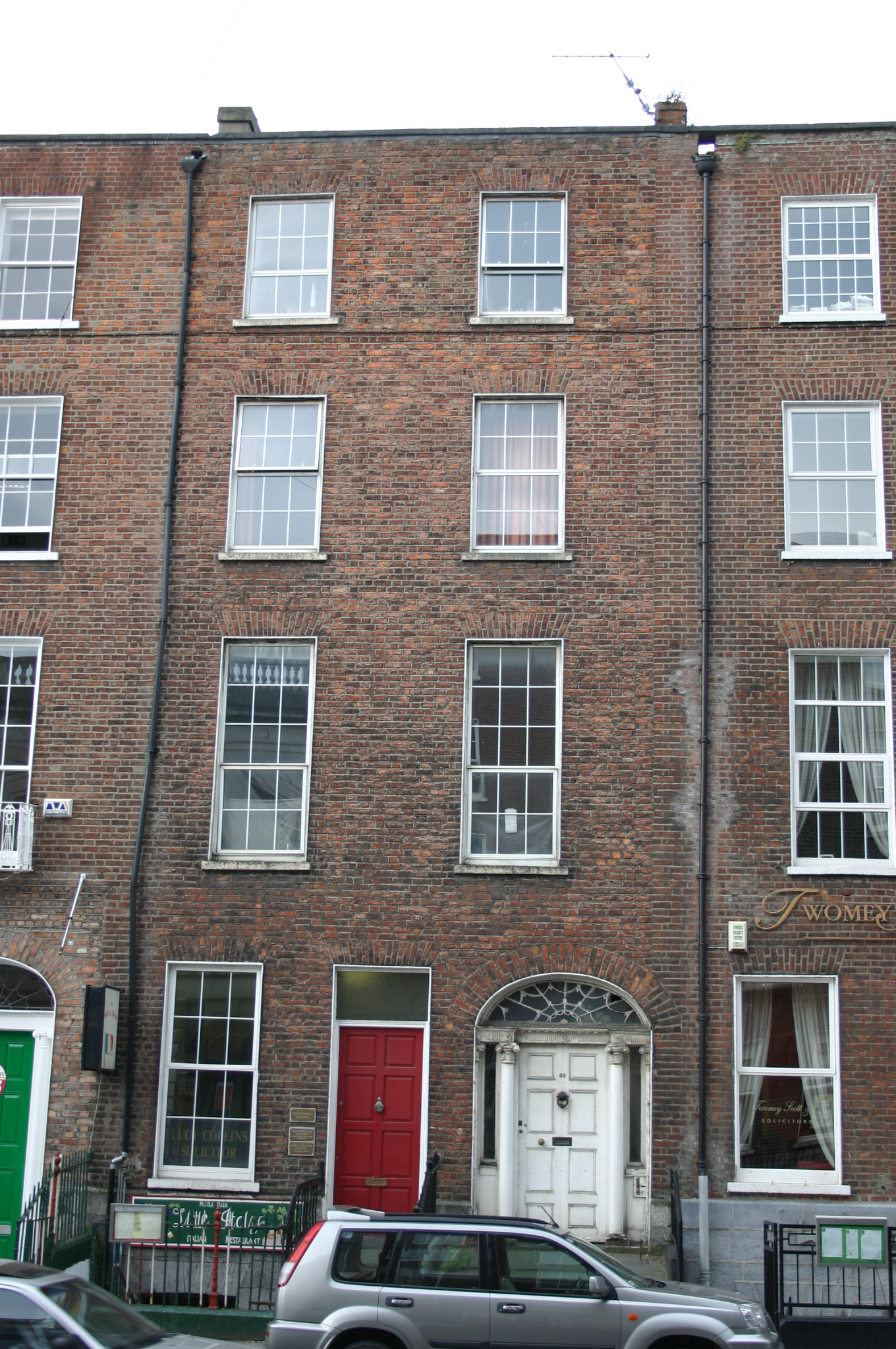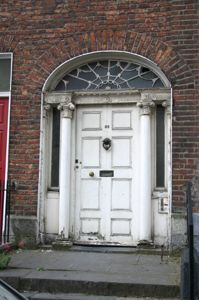 Terraced two-bay four-storey over basement former house, built c. 1820, with a front railed basement area. Pitched natural slate roof hidden behind parapet wall with limestone coping and a rendered chimneystack to the north party wall with a further brick chimneystack to the south party wall and uPVC rainwater goods. Red brick walls laid in Flemish bond with cement pointing and a limestone ashlar wall to the basement with moulded plinth course above. Gauged brick flat-arched window openings with rendered reveals, painted limestone sills and uPVC windows. Red brick walls to rear, rebuilt to the third floor with some timber Wyatt windows and a round-arched timber sash window to the stair half-landing. Gauged brick three-point arched door opening containing an inset timber doorcase comprising: a pair of engaged Ionic timber columns flanked by sidelights and a pair of quarter Ionic piers supporting a stepped fluted entablature with modillions and an Adamesque fanlight above. Square-headed door opening with original raised and fielded timber-panelled door leaf with a central fillet and brass furniture. Door opens onto a limestone threshold step and limestone platform and four steps. Platform enclosed to south by mild steel rail with original wrought-iron railing and cast-iron corner posts on a limestone plinth. A former central window opening has been modified to form an additional door opening c. 1970, with a timber-panelled door opening onto four concrete steps bridging the basement and enclosed by ornate cast-iron railing.