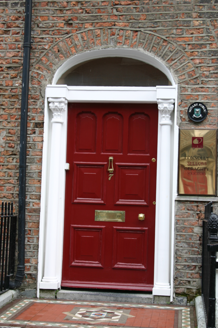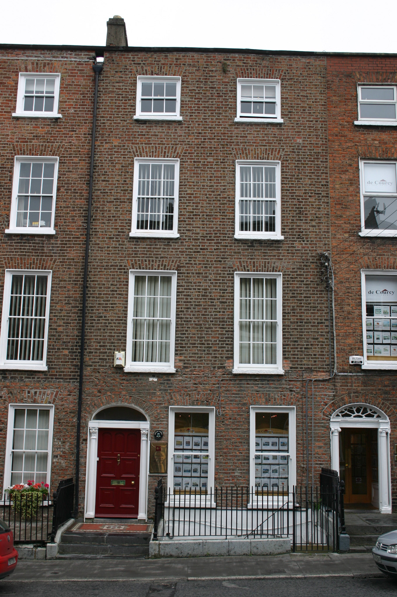 Terraced two-bay four-storey over basement brick house, built c. 1840. M-profile pitched roof concealed behind a parapet wall. Rendered chimneystacks to east party wall. Rendered chimneystack to west party wall with plain clay pots. Cast-iron rainwater goods. Red brick walls laid in Flemish bond, with limestone coping to parapet wall. Painted rendered basement elevation rising to the sill level of ground floor window. Square-headed window openings, patent rendered reveals, limestone sills, replacement three-over-three and six-over-six timber sash windows with ogee horns. Three-centred arched door opening, with red brick arch, patent rendered reveals, and replacement inset timber doorcase, c. 2000, with early panelled timber door leaf, c. 1890. Opens onto an encaustic tiled front door platform bridging basement area and arrived at from the pavement by a limestone steps and flanked by painted limestone plinth walls supporting modern steel railings which retains an original cast-iron rail post with pineapple finial. Concrete steps give access to basement area. Rendered two-bay two-storey former coach house to rear with replacement plank timber vehicular gate with integrated pedestrian door.