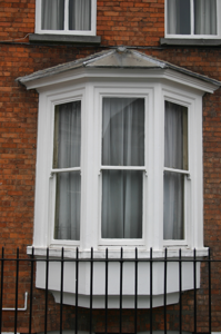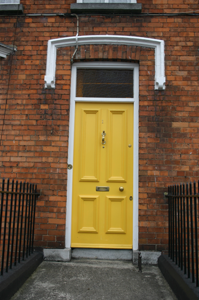 Terraced three-bay two-storey over basement red brick house, built c. 1895, with an oriel window and a railed basement area. Pitched artificial slate roof with black ridge tiles, and a shared red brick chimneystack to either party walls with clay pots and uPVC rainwater goods. Red brick walls laid in English garden wall bond. Gauged brick camber-arched window openings with limestone sills and two-over-two timber sash windows, and iron bars to basement, all having cylinder glass and ogee horns. Three-sided canted timber oriel window to ground floor with a hipped zinc roof and one-over-one windows and architrave surrounds, continuous sill and moulded corbelled out base. Gauged brick camber-arched front door opening with a painted label moulding and carved stone stops. Original timber-panelled door with brass furniture and rectangular overlight. Door opens onto concrete platform with cast-iron bootscraper and three concrete steps flanked by plain wrought-iron railings on painted plinth course enclosing basement area.