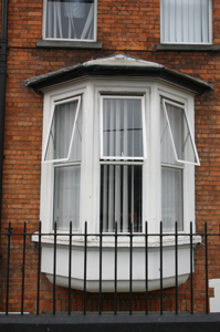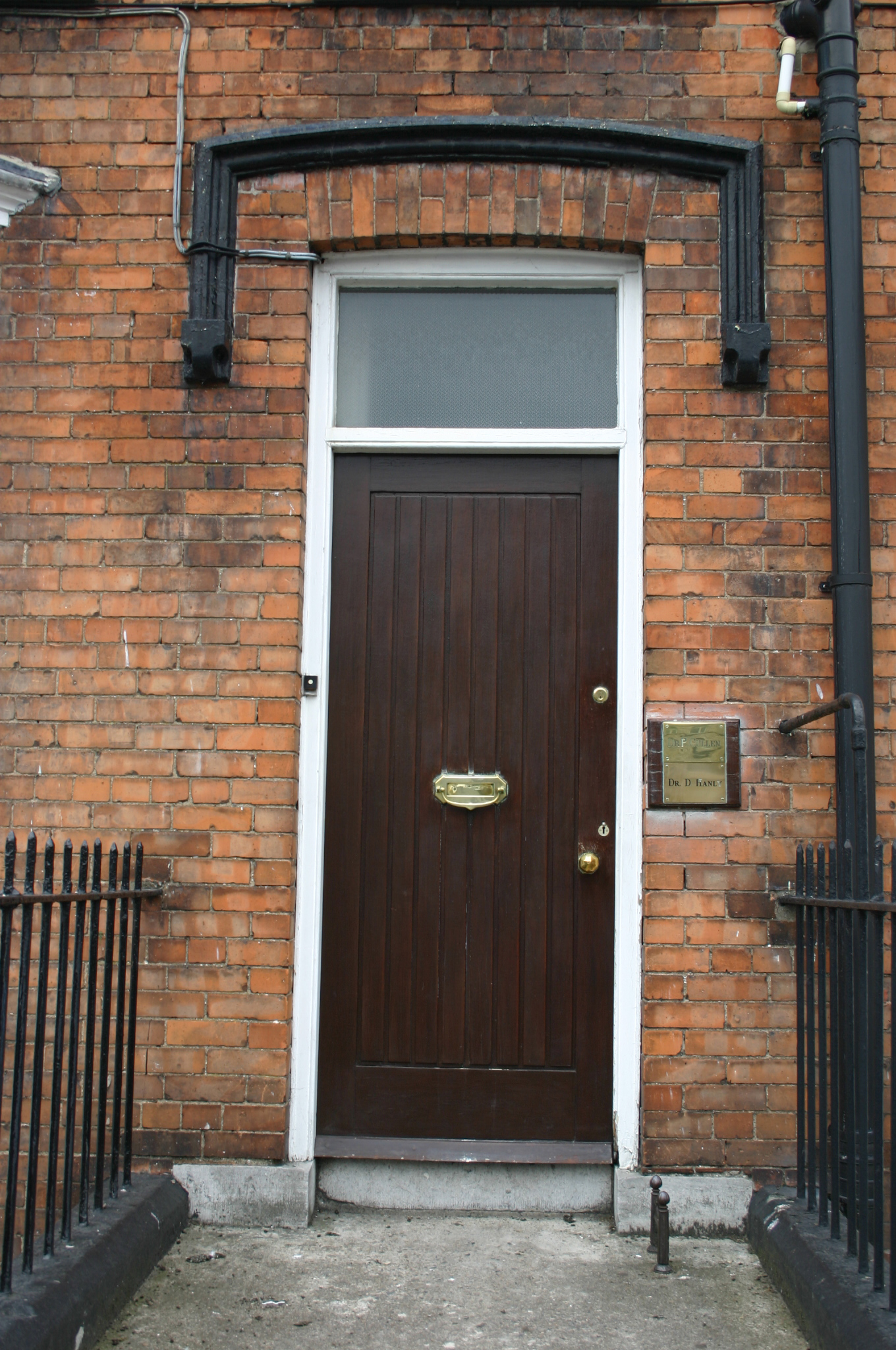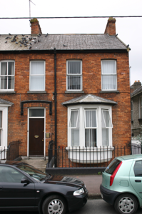 End-of-terrace three-bay two-storey over basement red brick house, built c. 1895, with an oriel window and a front railed basement area. Pitched natural slate roof with black ridge tiles, a shared red brick chimneystack to the south and a further red brick chimneystack rising from the north gable, clay pots to both. Cement coping to gable with cast-iron rainwater goods. Red brick walls to front, laid in English garden wall bond and returning to the rendered gable elevation. Gauged brick camber-arched window openings with limestone sills and replacement uPVC windows, reconfigured single window opening to basement with aluminium window. Three-sided canted timber oriel window to ground floor with a hipped zinc roof and uPVC windows, continuous sill and moulded corbelled out base. Gauged brick camber-arched door opening with a painted label moulding and carved stone stops. Replacement tongue and groove timber door with brass furniture and rectangular overlight. Door opens onto concrete platform with cast-iron bootscraper and two concrete steps. Steps flanked by simple wrought-iron railings on painted plinth course enclosing basement area.