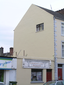 End-of-terrace two-bay three-storey over partially concealed basement stucco rendered house, built c. 1840, facing directly onto the public pavement, and prolonged to side by single-storey shop structure. Pitched natural slate roof with exposed gabled north-facing side elevation. Red brick chimneystack to south party wall. Cast-iron rainwater goods. Painted ruled and lined rendered walls with stucco quoins to sides. Exposed rubble limestone rear elevation with localised red brick infill. Square-headed window openings to façade, with painted stone sills, moulded stucco architraves with square block joints, and two-over-two timber sash windows with ogee horns to each level. Segmental-arched window openings with flush timber window frames and various permutations of timber casement windows two of which have margin-paned coloured glass overlights. Square-headed door opening, arrived at by two limestone steps, with wrought-iron railings on limestone plinth wall to north, having moulded stucco architrave with square block joints, limestone threshold step, and flat-panelled timber door leaf with name plate attached reading: J. Hodkinson & Sons Ecclesiastical Decorators. Leaded coloured glass overlight. Rubble limestone boundary wall encloses rear site.