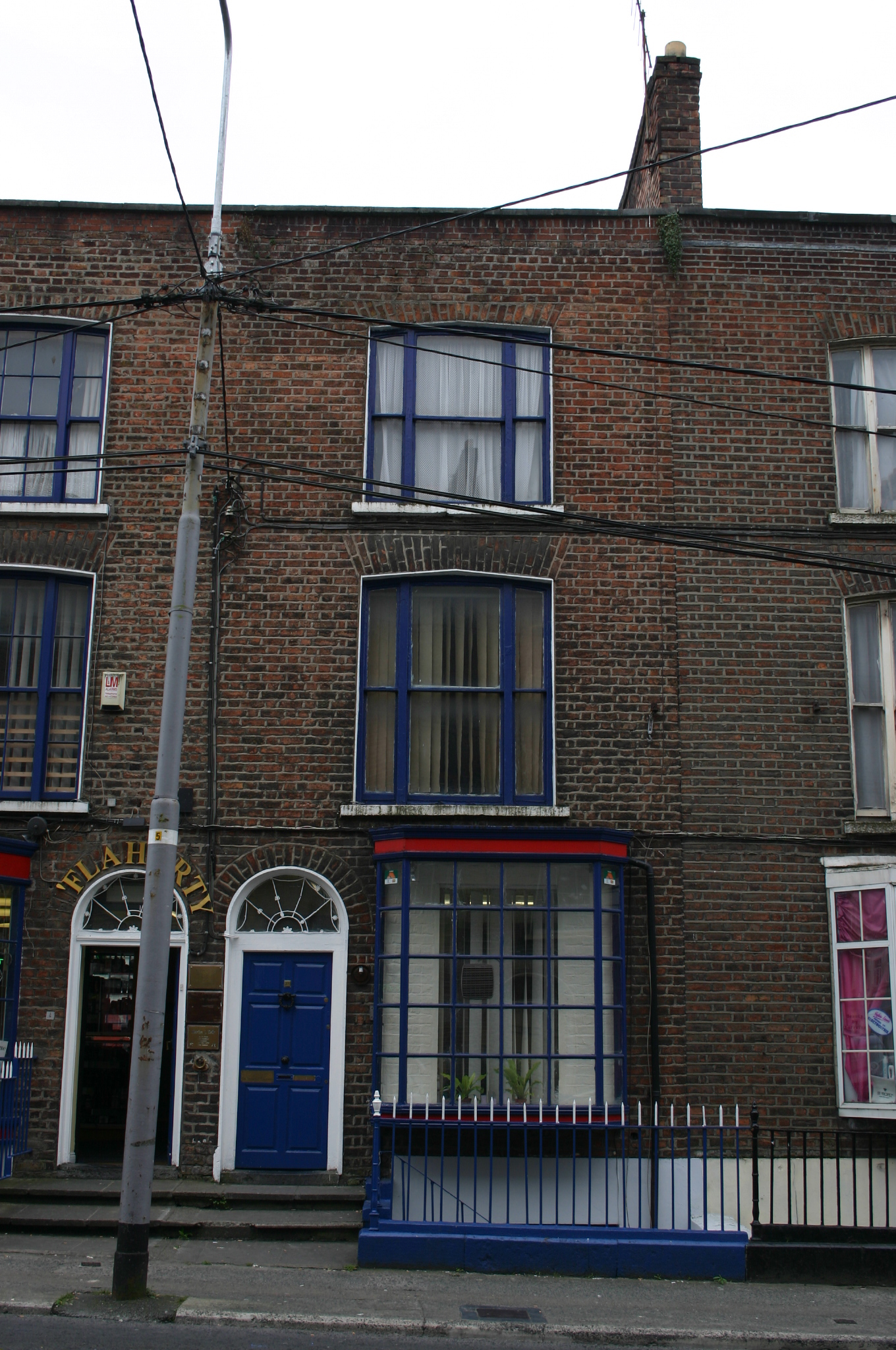Terraced single-bay three-storey over basement former townhouse, built c. 1820, with a front railed basement area. Pitched natural slate roof hidden behind rebuilt parapet wall with limestone coping and a shared red brick chimneystack to the east party wall with clay pots. Red brick walls laid in Flemish bond with cement pointing, and rendered wall to the basement, also rendered to rear. Gauged brick camber-arched window openings with patent rendered reveals, painted limestone sills and tripartite single-pane timber sash windows (possibly original with glazing bars removed). Five-sided timber multiple-pane oriel window c. 1950 in front of square-headed former window opening to ground floor. Gauged brick round-arched door opening with rendered reveals and plain surround having a raised and fielded timber-panelled door with original door furniture and a decorative lead webbed fanlight above with single glazed panel behind. Door opens onto limestone threshold step and a further two concrete steps shared with neighbouring building. Original wrought-iron railing and cast-iron corner posts set in concrete on a limestone plinth enclosing the basement area with modern steel gate and steps giving access to the basement. A cast-iron coal hole cover with limestone surround is located to the pavement. Two-storey cement rendered building to the rear.