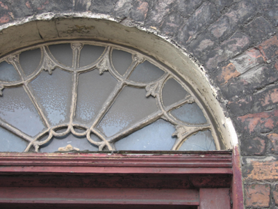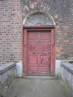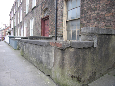 Terraced two-bay three-storey over basement house, built c. 1830, with a round-arched doorcase to east. Roof behind parapet wall forming a single-span pitched slate roof, red brick chimneystack to west party wall. uPVC rainwater goods. Lime rendered basement elevation with stone plinth course at ground floor level. Hand-made red brick laid in Flemish bond with lime mortar pointing and localised cement mortar repairs. Limestone coping to parapet wall. Exposed coursed rubble limestone rear elevation with red brick infill. Round arch door opening with patent rendered reveals, and doorcase comprising panelled uprights, c. 1890, joined by moulded timber lintel. Original raised and fielded panelled timber door with brass and door furniture. Original radiating fanlight with historic glass. Flat-arched window openings, camber-headed to basement level, patent rendered reveals, painted stone sills, encaustic tiled sill to basement opening. Eight-over-eight timber sash window to basement, with missing glazing bars to lower sash, six-over-six timber sash windows to upper floors. Historic glass surviving. Encaustic tiled front site basement area enclosed by rendered walls surmounted by rendered plinth wall capped by limestone coping. Two openings lead to cellars under the pavement. Single limestone step to slate slab front door area. Limestone door threshold. Limestone flag to front site pavement with square cast-iron coal hole cover.