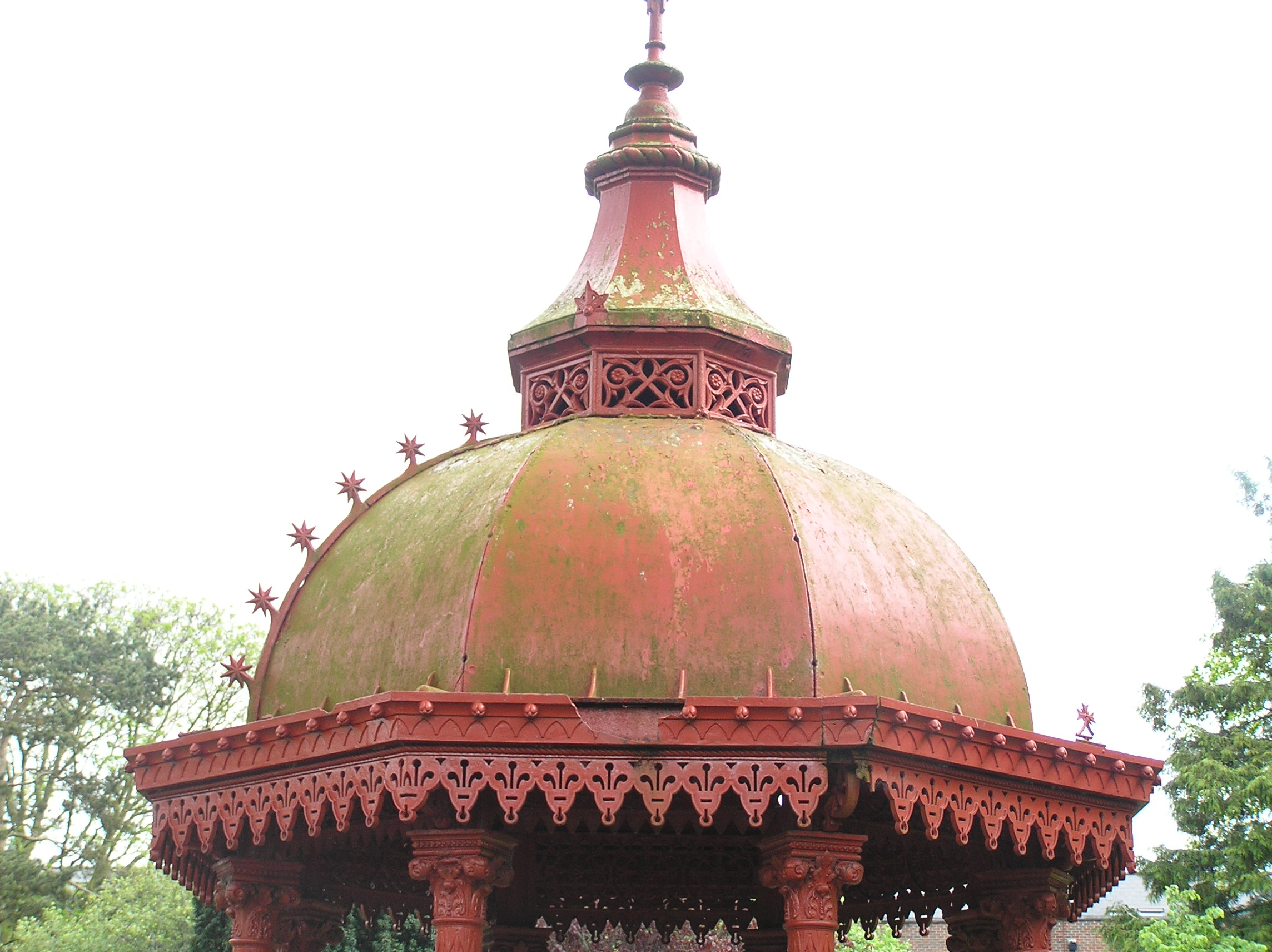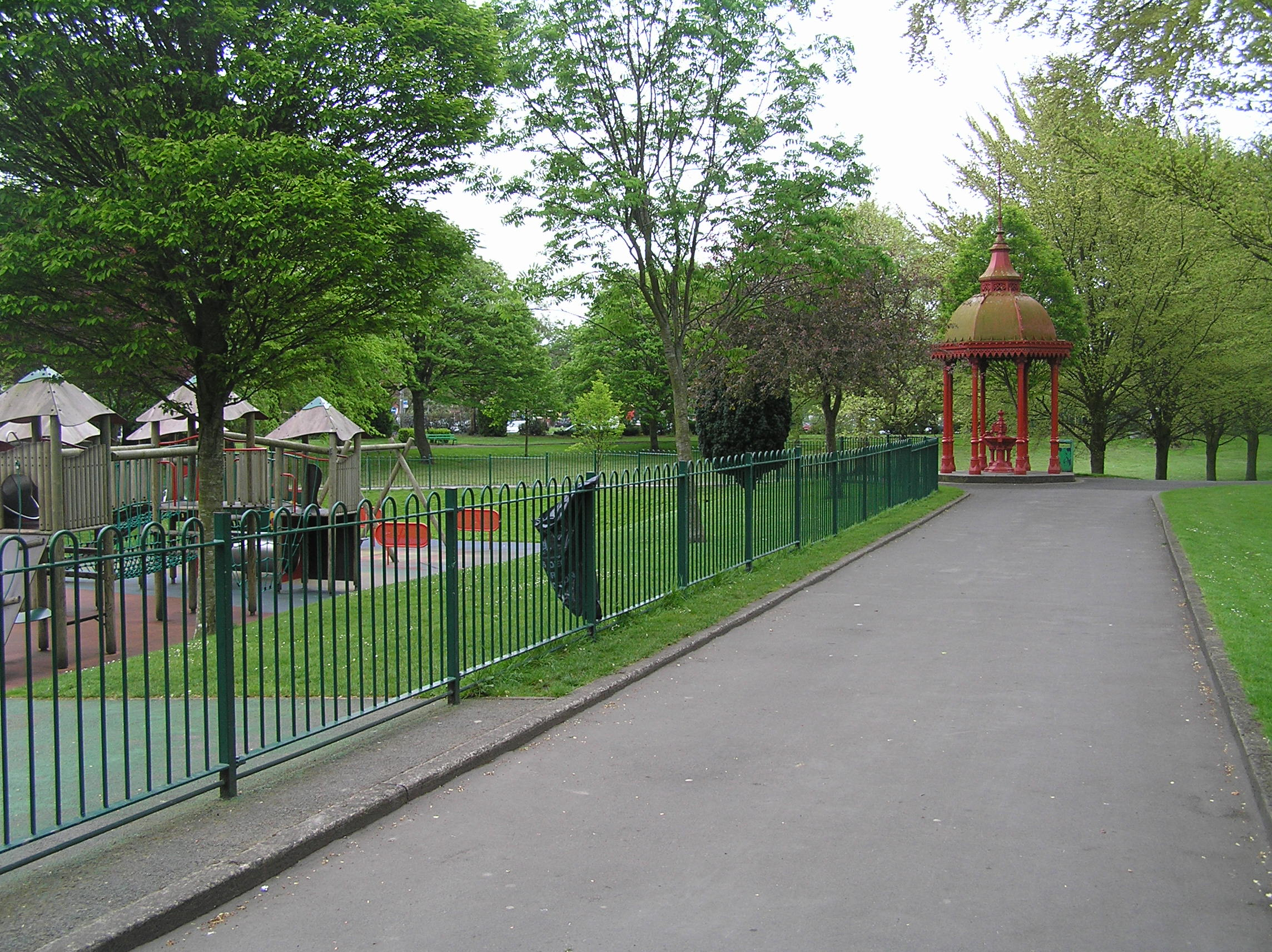 Freestanding cast-iron fountain, erected c. 1877, with a dome shelter situated in the People's Park. Comprising of a cruciform plan, plinth base and square pier surrounded by four squat colonnettes with capitals supporting brackets which holds a round basin. Four foliate brackets divide the basin in four and rise to a tapering finial with sphere. Set on an octagonal limestone platform with eight cast-iron Corinthian columns supporting an octagonal dome. Decorative trim extends beyond the capitals with a decorative gutter above. A single ridge with star motif remains. Manufactured by George Smith and Co. of the Sun Foundry, Glasgow.
