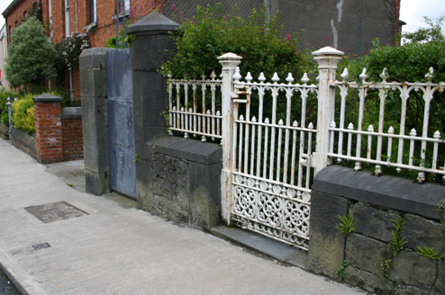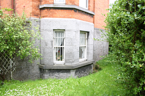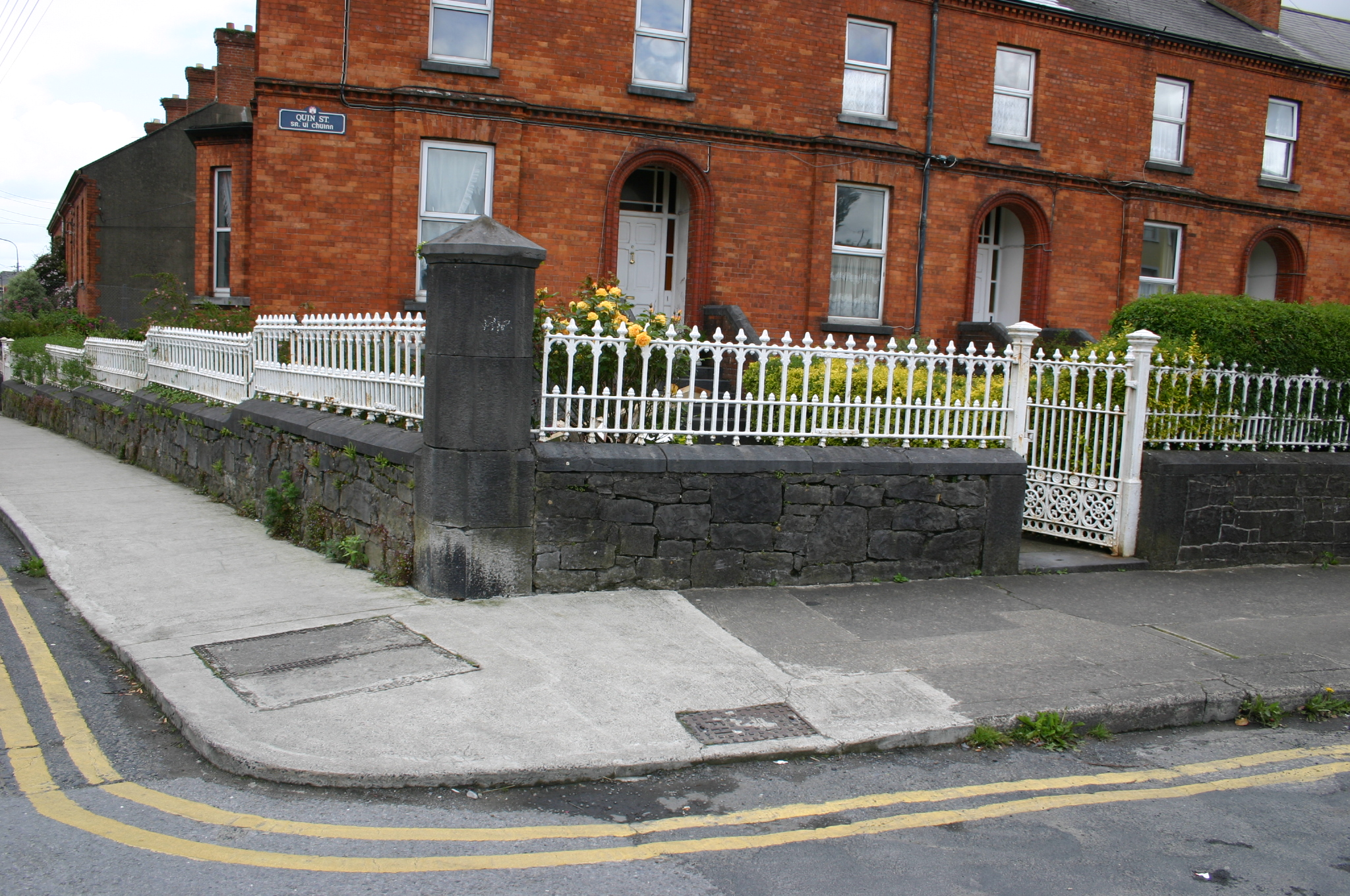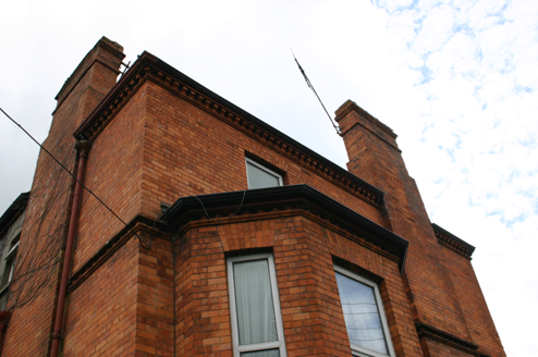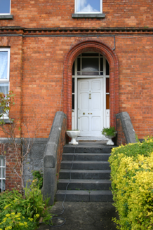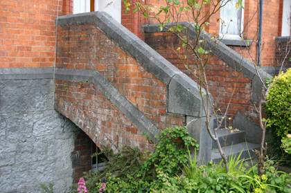 End-of-terrace two-bay two-storey over basement red brick and limestone house, built in 1892, with an arched opening leading to recessed entrance porch, a two-storey three-sided canted bay window to side elevation, and a two-storey over basement return. Hipped artificial slate roof to house and return. Three red brick chimneystacks, one to party wall, and one each of side and rear elevation with stringcourses and octagonal and plain clay pots. Cast-iron rainwater goods. Squared and coursed limestone basement elevation and part of rear elevation, with limestone ashlar plinth course delineating ground floor level. Non-facing red brick to breakfront window on front basement elevation. Red brick-faced walls elsewhere, laid in English garden wall bond, with moulded red brick dog-tooth course delineating first floor level and corbelled brick eaves course. Square-headed window openings, red brick flat arch, reveals, and limestone sills surrounding replacement uPVC windows. Original one-over-one timber sash windows to basement level and return. Front elevation window at ground and basement level breaks forward slightly from elevation. Tooled limestone facing to basement level of bay window, red brick above, with continuous sill course and red brick eaves detailing. Round-arch porch opening with moulded brick surround and reveals, arrived at by a flight of limestone steps flanked by red brick-faced plinth wall with limestone ashlar coping. Tiled entrance porch floor. Tripartite timber doorcase comprising two-pane side lights over panelled timber bases, and margin-paned coloured glass overlight. Raised and fielded panelled timber door with stop-chamfer detailing. Brass door furniture. Site enclosed by squared rubble limestone plinth wall with ashlar limestone coping and chamfered corner pier, supporting cast-iron railings. Two pedestrian entrances with cast-iron rail posts support cast-iron pedestrian gate. Sheet metal gate held by limestone ashlar piers gives additional access to the rear site. Rear site access lane with rubble limestone boundary wall and plank timber gate set in brick-framed opening.
