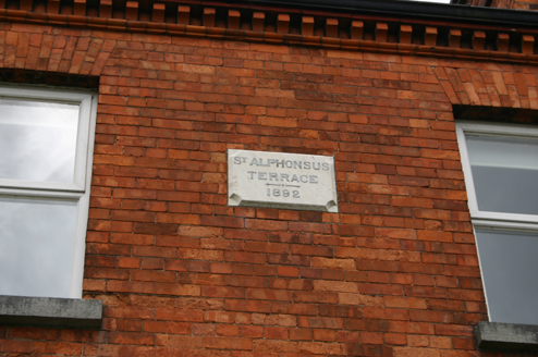 Terraced two-bay two-storey over basement red brick and limestone house, built in 1892, having an arched opening leading to recessed entrance porch, a shallow breakfront window bay at ground and basement level, and a two-storey over basement return, with later single-storey outbuilding attached. Hipped artificial slate roof to house and return. Red brick chimneystacks to party walls, with stringcourses and octagonal and plain clay pots. uPVC rainwater goods. Squared and coursed limestone basement and rear elevation, with limestone ashlar plinth course delineating ground floor level. Non-facing red brick to breakfront window on front basement elevation and return elevations. Red brick faced walls elsewhere, laid in English garden wall bond, with moulded red brick dog-tooth course delineating first floor level and corbelled brick eaves course. Date plaque to window pier reading: ST. ALPHONSUS TERRACE 1892. Square-headed window openings, red brick flat arches, reveals, and limestone sills surrounding original one-over-one and four-over-four timber sash windows and replacement uPVC windows. Round-arch porch opening with moulded brick surround and reveals, arrived at by a flight of limestone steps flanked by red brick faced plinth wall with limestone ashlar coping, re-laid on lead moisture course. Tiled entrance porch floor. Tripartite timber doorcase comprising two-pane side lights over panelled timber bases, and margin-paned coloured glass overlight. Raised and fielded panelled timber door with stop-chamfer detailing. Brass door furniture. Site enclosed by squared rubble limestone plinth wall with ashlar limestone coping supporting cast-iron railings. Pedestrian entrance with limestone step and cast-iron rail posts support cast-iron pedestrian gate. Rear site access lane with red brick boundary wall having sheet metal pedestrian gate.