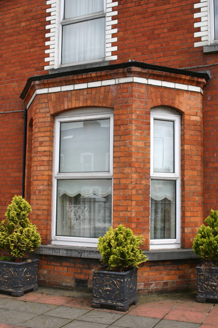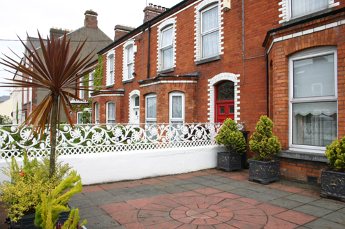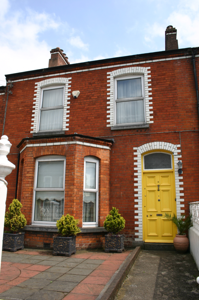 Terraced two-bay two-storey house, built in 1904, with a three-sided canted bay window and glazed white tile dressing, forming part of a uniform terrace. Gabled two-storey return to rear. Pitched artificial slate roof, with small dormer to rear span. Two shared red brick chimneystacks, with glazed white brick stringcourse and an additional red brick stack to the return. Cast-iron rainwater goods. Red brick walls and bay window laid in English garden wall bond with glazed white brick stretcher course beneath ovolo-moulded red brick eaves course. Rendered rear elevation. Segmental-arched window openings with glazed white brick arch and reveals, limestone sills, and uPVC windows. Concave segmental moulded course to bay window. Segmental-arched door opening with glazed white brick arch and reveals, and original flat-panelled timber door with glazed upper panels and frosted glass overlight. Front site enclosed from road and neighbouring houses by rendered plinth wall supporting cast-iron railings, which continues uniformly along the terrace. Rendered gate pier to south with original cast-iron gate. Rear site enclosed by rubble limestone wall with plank timber pedestrian gate.