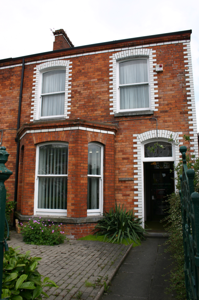 End-of-terrace two-bay two-storey house, built in 1904, with a three-sided canted bay window and glazed white tile dressing, forming part of a uniform terrace. Gabled two-storey return to rear prolonged by single-storey accretion. Pitched artificial slate roof, with small dormer to rear span. Two shared red brick chimneystacks, with glazed white brick stringcourse and an additional red brick stack to the return. Replacement metal and cast-iron rainwater goods. Red brick walls and bay window laid in English garden wall bond with glazed white brick stretcher course beneath ovolo-moulded red brick eaves course. Concave segmental moulded course to bay window. Rendered rear elevation. Segmental-arched window openings with glazed white brick arch and reveals, limestone sills, and one-over-one timber sash windows. Segmental-arched door opening with glazed white brick arch and reveals, and flat-panelled timber door leaf, with leaded coloured glass overlight. Front site enclosed from road and neighbouring houses by rendered plinth wall supporting cast-iron railings, which continues uniformly along the terrace. Rendered gate pier to south with original cast-iron gate. Rear site enclosed by rubble limestone wall with plank timber gates hanging from steel gate posts. Limestone wall squared off to form the opening.