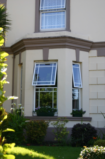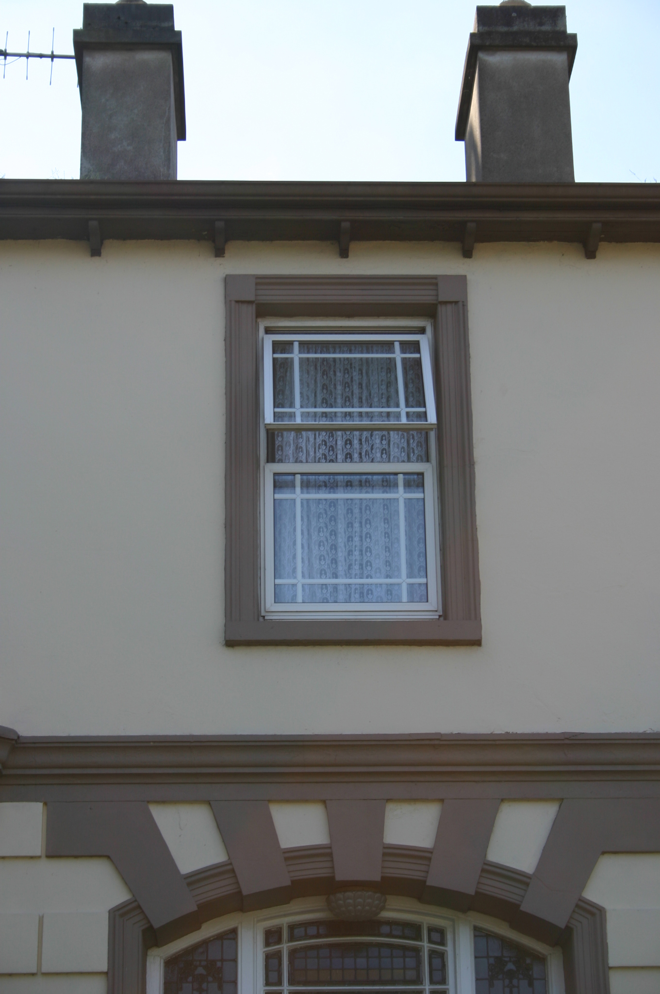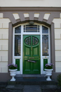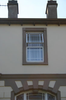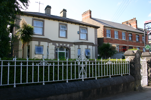 An early twentieth-century example of the villa style house, with a rather sombre character one associates with parochial houses of the time. It forms a simple and effective symmetrical composition enriched by stucco detailing and an interesting front door treatment. Front site boundary and axially placed pedestrian entrance forming part of the overall composition.