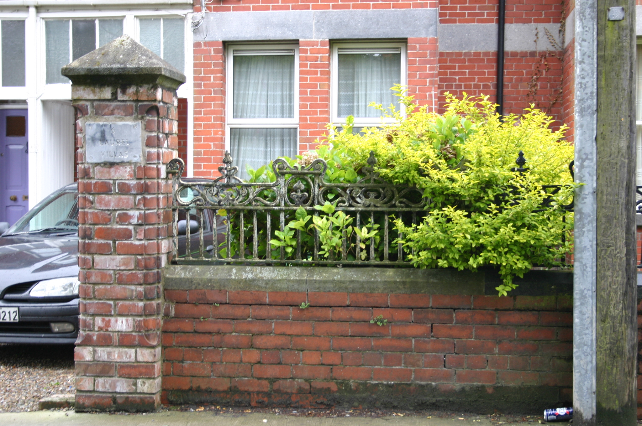 Terraced two-bay two-storey red brick house, built c. 1900, with a full-height three-sided bay window surmounted by a gabled dormer attic storey, built as part of a uniform terrace of seven houses. Shared gabled return. Pitched gabled slate roof with intersecting gabled dormer roof. Roof lights to front and rear span. Red brick chimneystack to apex of gabled side elevation and return, each having stringcourse, dog-tooth cornice and plain clay pots. Cast-iron rainwater goods. Red brick walls laid in English garden wall bond with corbelled brick eaves course, with moulded red brick sill course doubling as frieze architrave. Dormer gable treated as a moulded rendered broken base pediment with finial to apex. Cement rendered rear elevation. Square-headed window openings, with continuous limestone lintel bands at ground and first floor level, red brick reveals, continuous limestone or moulded red brick sill courses, with replacement uPVC windows, early timber casements to attic level. Two-over-two timber sash windows and casement windows to the rear elevation. Partially glazed timber-framed entrance porch with turned plain timber vertical supports joined timber balustrade. Tiled entrance platform. Square-headed door opening, continuous limestone ashlar lintel, reveals and limestone threshold step. Plain doorframe with raised and fielded panelled timber door with stop-chamfer detailing and glazed upper panels. Plain cylinder glass overlight. Porch roof with plain timber rafters and wired glass sheeting. Front site partially enclosed by red brick faced plinth wall and panelled red brick pier both with painted capping stones supporting Art Nouveau inspired cast-iron railings. Plaque with incised lettering reads: 6 Laurel Villas.