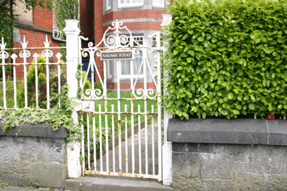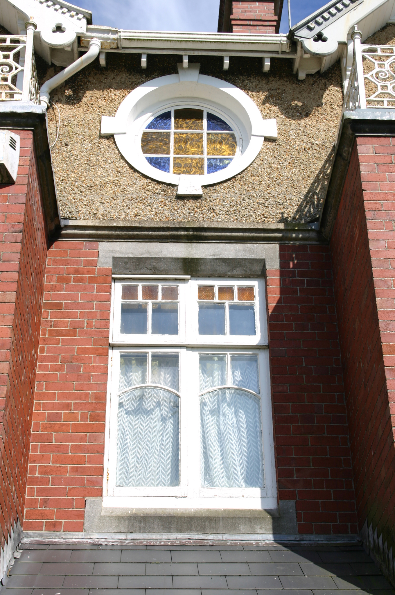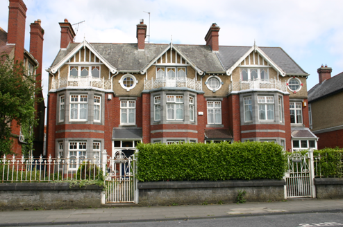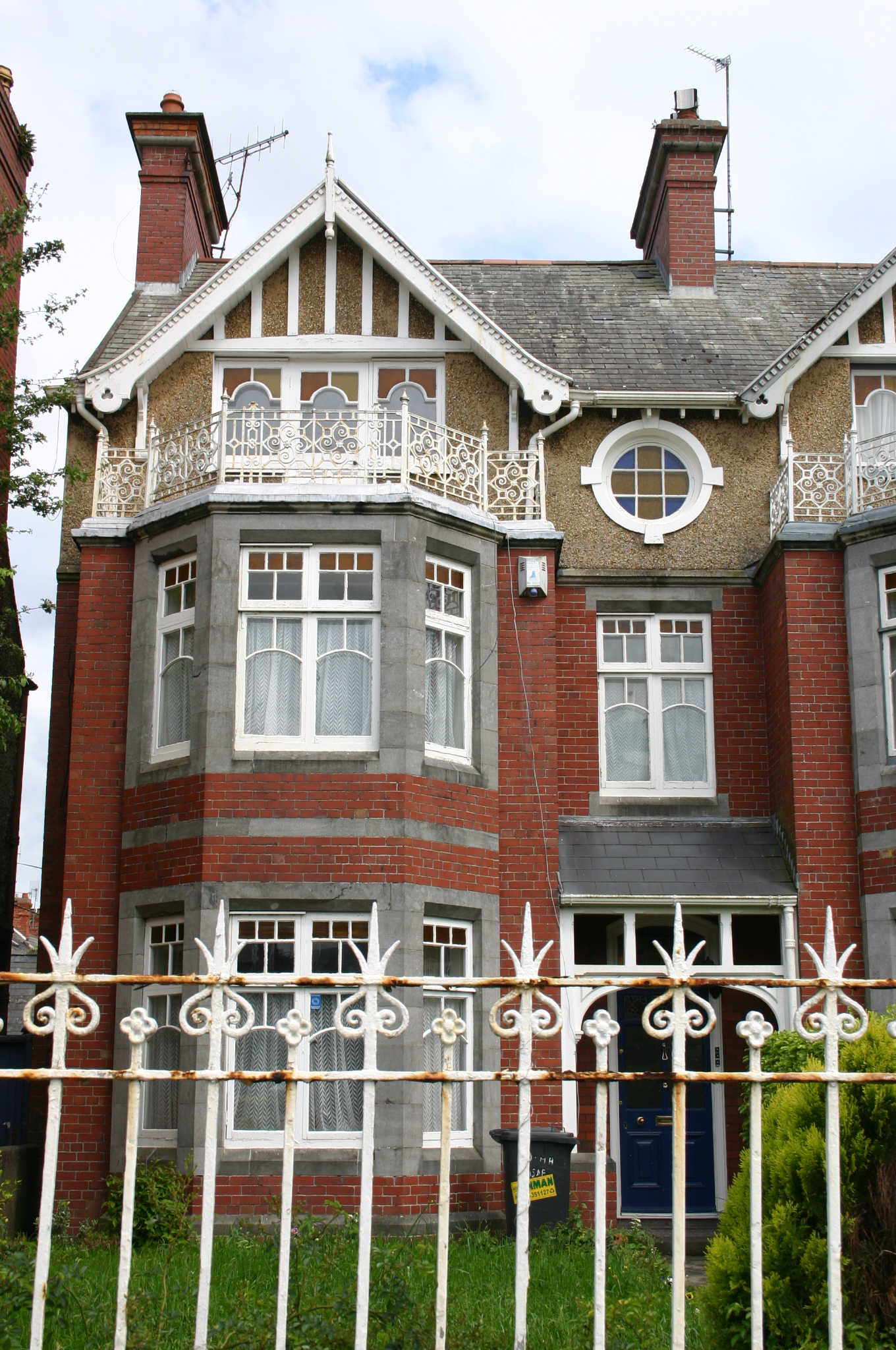 End-of-terrace two-bay three-storey red brick and pebbledash rendered house, built c. 1900, with an advancing two-storey three-sided canted bay window surmounted by balustraded balcony accessed by gabled half-dormer window bay. Engaged return to rear. Pitched natural slate roof with terracotta ridge tiles, intersecting secondary dormer gable roof with elaborately detailed timber bargeboard having timber finial to apex. Flat-roofed dormer to rear span. Red brick chimneystack with stringcourse and cornice beneath concrete flaunching to north gable wall and south party wall, with moulded clay pots. Façade at ground and first floor level faced in red brick laid in English garden wall bond with limestone plinth course, and red brick wrapping around bay window aprons. Moulded rendered stringcourse delineates second floor level, which is finished in a pebbledash render. Timber strutwork to dormer gable. Plain rendered rear elevation. Square-headed window opening over front door with red brick reveals, flush chamfered limestone lintel and sill and two-leaf timber casement window with overlights and curvilinear glazing bars. Oculus above with smooth rendered surround and fixed multiple-paned coloured glass light. Three-sided canted bay window with limestone ashlar surround comprising piers, flush chamfered sills and lintel. Single and two-leaf timber casement window with overlights and curvilinear glazing bars. Cast-iron panelled balustrade enclosing bay balcony. Square-headed balcony opening comprising door flanked by sidelights, with curvilinear glazing casement echoed by glazed door panel. Covered front door porch with timber frame rising from red brick plinth base, having closed brackets and open tripartite light. Encaustic tiled entrance platform and limestone step. Segmental-arched door opening with plain timber doorframe, glazed and timber-panelled door leaf and leaded coloured glass segmental overlight. Front site enclosed by snecked and coursed limestone plinth wall with limestone ashlar coping supporting wrought-iron railings. Cast-iron gateposts supporting wrought-iron gate leaf. Rear site boundary treatment, c. 1990.