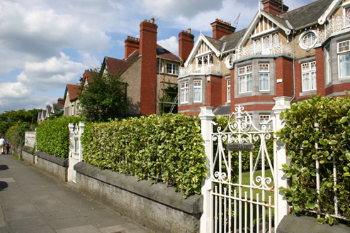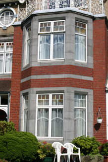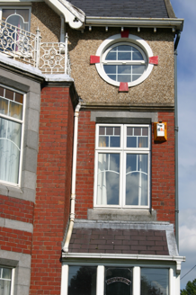 End-of-terrace two-bay three-storey red brick and pebbledash rendered house, built c. 1900, with an advancing two-storey three-sided canted bay window surmounted by balustraded balcony accessed by gabled half-dormer window bay. Return to rear. Pitched artificial slate roof, and intersecting secondary dormer gable roof with elaborately detailed timber bargeboard having timber finial to apex. Flat-roofed dormer to rear span. Red brick chimneystack with stringcourse and cornice beneath concrete flaunching to north party wall, with moulded clay pots. Façade at ground and first floor level faced in red brick laid in English garden wall bond with limestone plinth course, and red brick wrapping around bay window aprons. Moulded rendered stringcourse delineates second floor level, which is finished in a pebbledash render. Timber strutwork to dormer gable. Plain rendered side and rear elevation. Square-headed window opening over front door with red brick reveals, flush chamfered limestone lintel and sill. Oculus above with smooth rendered surround. Three-sided canted bay window with limestone ashlar surround comprising piers, flush chamfered sills and lintel. Replacement uPVC windows throughout. Cast-iron panelled balustrade enclosing bay balcony. Square-headed balcony opening comprising door flanked by sidelights, with replacement uPVC door leaf and sidelights. Covered front door porch with replacement glazed uPVC frame rising from red brick plinth base. Segmental-arched door opening with plain timber doorframe, leaded coloured glass paned timber-panelled door leaf and leaded coloured glass segmental overlight. Front site enclosed by snecked and coursed limestone plinth wall with limestone ashlar coping supporting wrought-iron railings. Cast-iron gateposts supporting wrought-iron gate leaf. Rubble limestone rear site boundary wall.