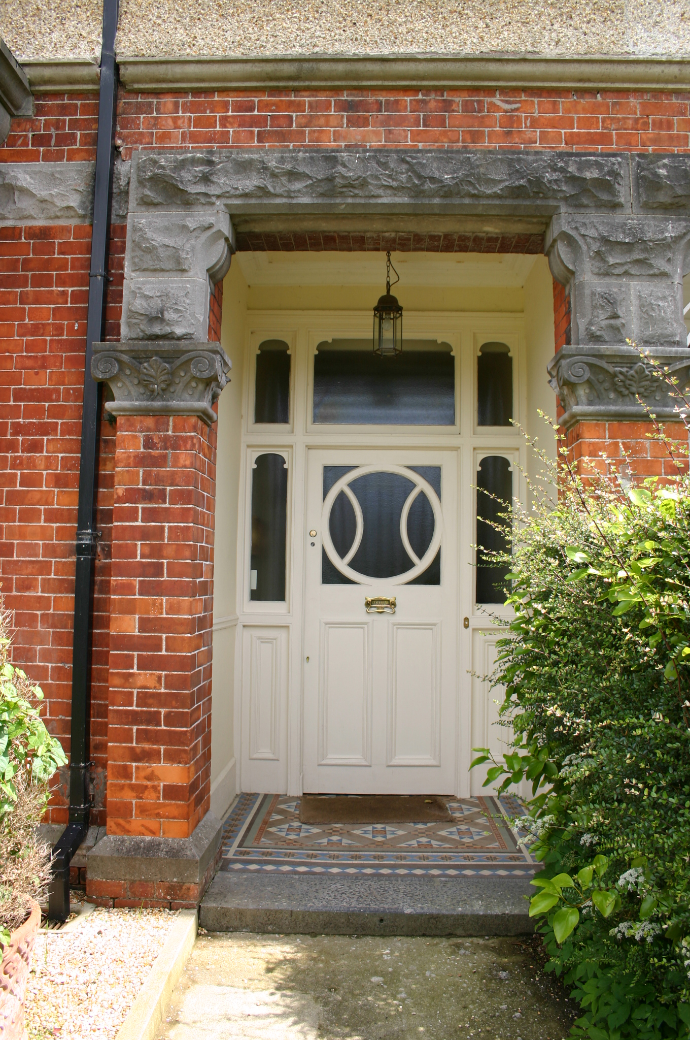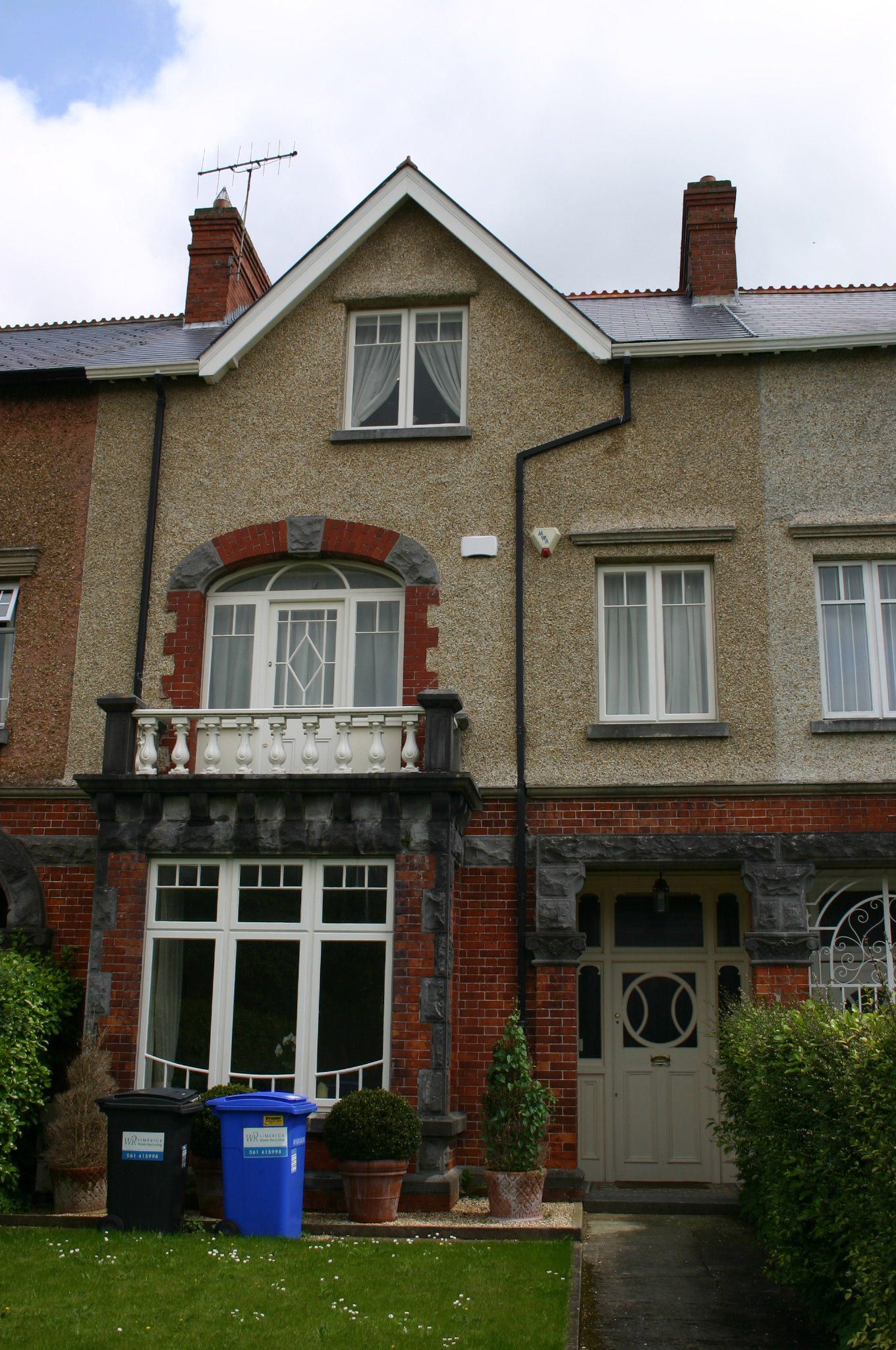 Terraced two-bay three-storey rendered house built c. 1910, with entrance porch paired with neighbouring house to south. Three-sided bay window with balustraded balcony above accessed through large three-centred arched opening. Centrally-placed gabled half dormer to second floor. Return to rear prolonged by single-storey flat-roofed accretion. Pitched artificial slate roof with intersecting secondary dormer gable and return roof. Terracotta comb ridge tiles. Red brick chimneystacks to north and south party wall each with a stringcourse and stepped cornice beneath concrete flaunching; plain clay pots. uPVC rainwater goods. Façade at ground floor level faced in red brick laid in Flemish bond, with limestone plinth course and ovolo-moulded concrete stringcourse delineating first floor level. Pebbledash render to first and second floor. Square-headed window opening over front door and to second floor with pebbledash rendered reveals, limestone sills, profiled drip mould, and bipartite three-pane timber casement window. Red brick three-sided bay window with tripartite and single-leaf timber casement window frames having curvilinear glazing bars and four-paned overlights to tripartite window. Bay enriched by rock-faced limestone dressing comprising, plinth course, quoining, continuous sill course, lintel course and corbelled cornice above which a limestone piered balustrade encloses balcony, with possibly cast-iron balusters. Three-centred arched opening accessing bay balcony comprising red brick block-and-start uprights with rock-faced limestone imposts and keystone with gauged red brick completing arch. Margin-paned glazed timber door flanked by sidelights, with fanlight above. Recessed paired square-headed entrance porch comprising red brick pilasters with limestone plinth course and foliate capitals above which are rock-faced imposts and corbel blocks supporting single rock-faced lintel block. Tiled porch platform and tooled limestone step. Running mould cornice to porch ceiling. Tripartite timber doorcase comprising glazed sidelights over panelled timber bases flanking flat-panelled timber door with elaborate glazed upper panel. Tripartite overlight above, all with frosted glass. Front site enclosed by rock-faced limestone plinth wall supporting cast-iron railings with pedestrian gate paired with neighbouring house comprising rock-faced limestone piers supporting cast-iron gate and limestone step. Concrete path to front door.