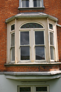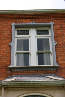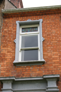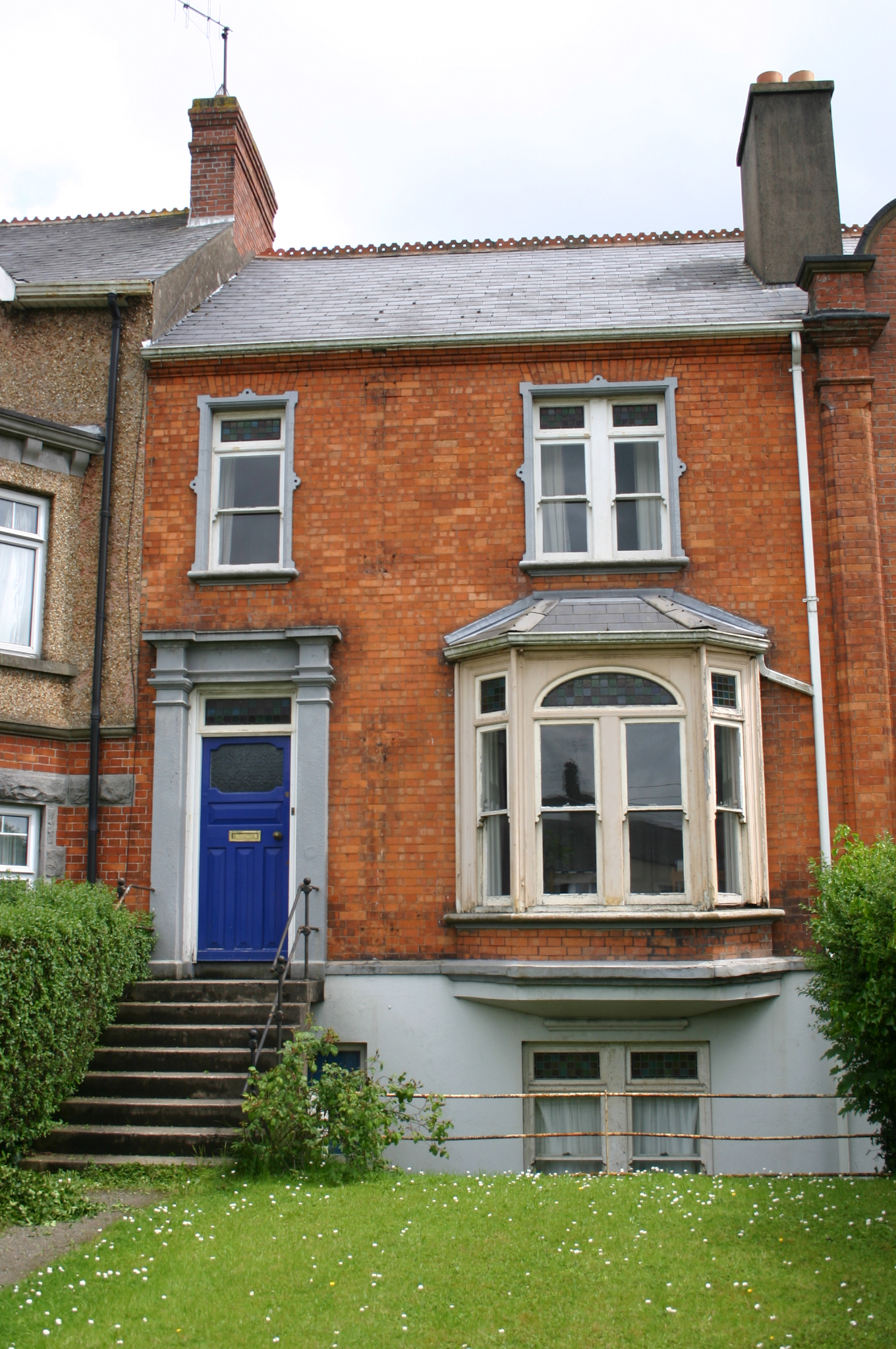 Terraced two-bay two-storey over basement red brick house, built c. 1910, with oriel three-sided canted bay window and square-headed rendered doorcase. Single-bay two-storey return to rear. Pitched artificial slate roof with terracotta comb ridge tiles. Cement rendered chimneystack to front and rear span rising from south party wall. uPVC rainwater goods. Painted rendered basement elevation with painted plinth course delineating ground floor level. Red brick walls laid in Flemish bond with flush mortar pointing. Moulded red brick eaves course supporting rainwater goods. Three-sided canted bay window comprising rendered oriel base with painted plinth course, red brick apron and continuous timber sill supporting a bull nose moulded timber-framed bay structure and hipped lean-to artificial slate roof. Bipartite and single one-over-one timber sash windows with ogee horns, having three-centred leaded coloured glass fanlight over bipartite opening and rectangular overlights to sides. Two square-headed window openings to first floor with red brick flat arch, moulded rendered architrave and nosed limestone sill with fillet moulding beneath, and single and bipartite arrangement comprising one-over-one timber sash windows with central timber mullion, ogee horns and leaded coloured glass overlights. Square-headed window opening to basement elevation and rear elevation with rendered reveals, painted sills, single and bipartite window arrangements one-over-one and two-over-two timber sash windows with leaded coloured glass overlights to façade basement window. Square-headed stucco door opening comprising Doric pilasters joined by plain entablature breaking forward over pilasters. Simple doorframe with raised and fielded panelled timber door having horizontal frosted glazed panel and leaded coloured glass overlight. Arrived at by a flight of concrete steps with only cast-iron railing posts surviving. Front site enclosed by rendered plinth wall supporting cast-iron railing panels. Rendered pier and cast-iron gate post with cast-iron gate.