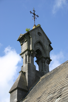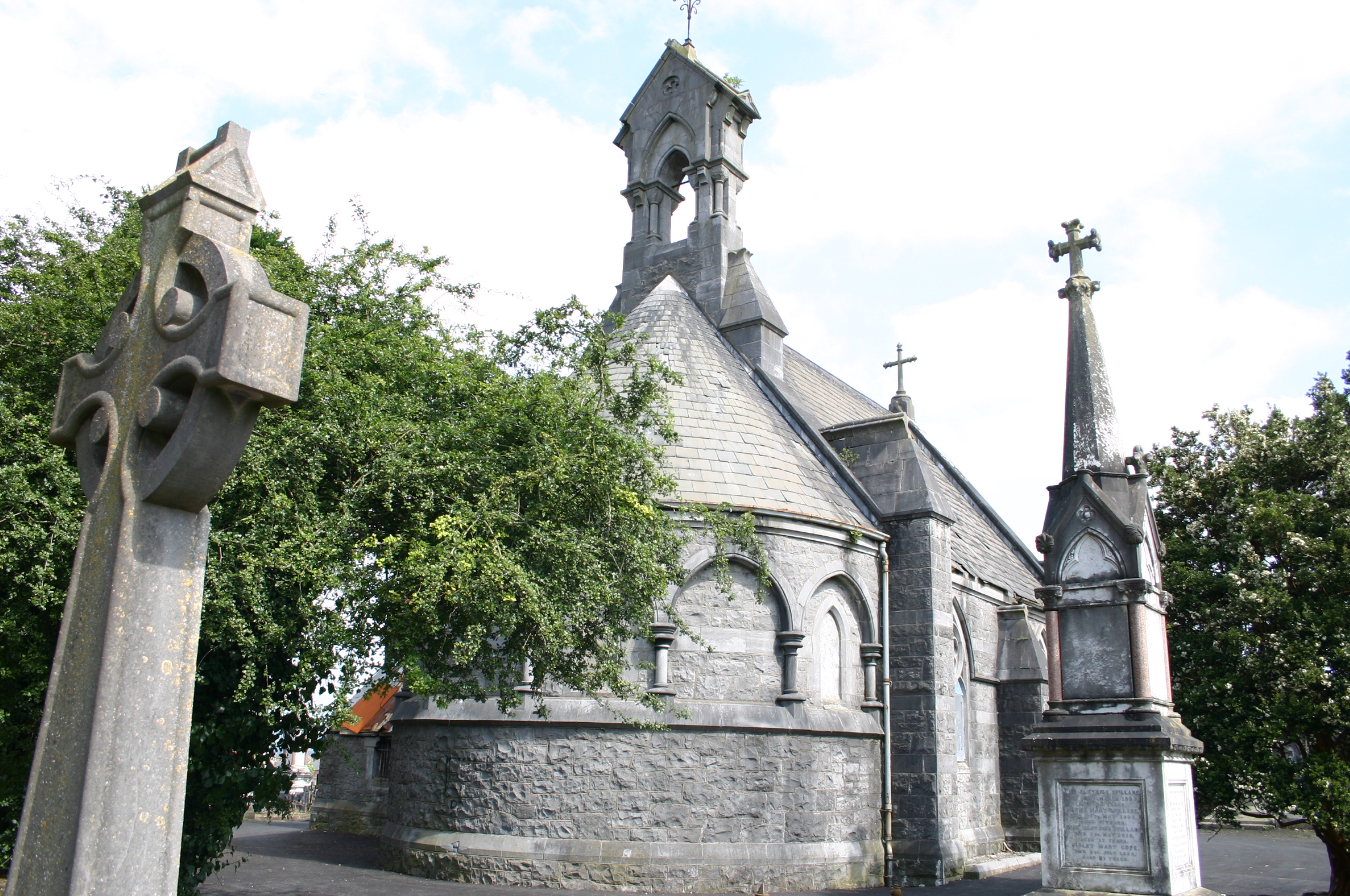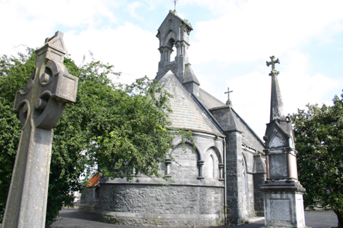 Detached single-storey single-bay gabled mortuary chapel, built c. 1855, having two-bay sides, with buttressing articulating window piers, and bowed blind arcaded apse to rear. Elaborately conceived limestone ashlar belfry rises from southern gable to which apsidal elevation is attached. Sacristy wing attached to west elevation with abutting chimneystack. Pitched natural slate roof and interlocking secondary roof structures. Slate replaced to sacristy by sheet metal, and lost exposing timber batons to much of western pitch. Cast-iron rainwater goods survive in part. Squared and snecked hammered limestone ashlar walls with original flush pointing, rising to form gable with limestone ashlar parapet coping which is surmounted by apexes. Smooth limestone ashlar bands to elevations returning around rock-faced limestone buttresses. North elevation comprising tall pointed arch rising from unfinished colonnettes with cushion capitals, on a raised base, set in negative reveal to support bull nose moulded smooth ashlar limestone arch, with stopped hood moulding above. Oculus to tympanum with limestone tracery, which is proud of the recessed glazing, forming four linked circles with quatrefoil tracery inset. Pointed-arch window openings with smooth ashlar tracery comprising pointed arch vertical openings with circular tracery above having sexfoil inner tracery. Windows blocked-up from inside with additional sheet metal covering. Square-headed door opening, with corbelled corners, bull nose profiled reveals, and sheet metal gates. Square-headed sacristy door with half-dormer gable rising from corbelled blocks, and having sheet metal door with original wrought-iron hinges. Fine interior with High Church decoration influenced by the Arts and Crafts movement, seen in the highly decorative wall mosaics, polychromatic floor tiles, carved stone altar, hammerbeam nave roof and the orignal carved timber pews. Fine pinnacled Spillane monument to southeast within immediate hard surface site surrounding chapel.
