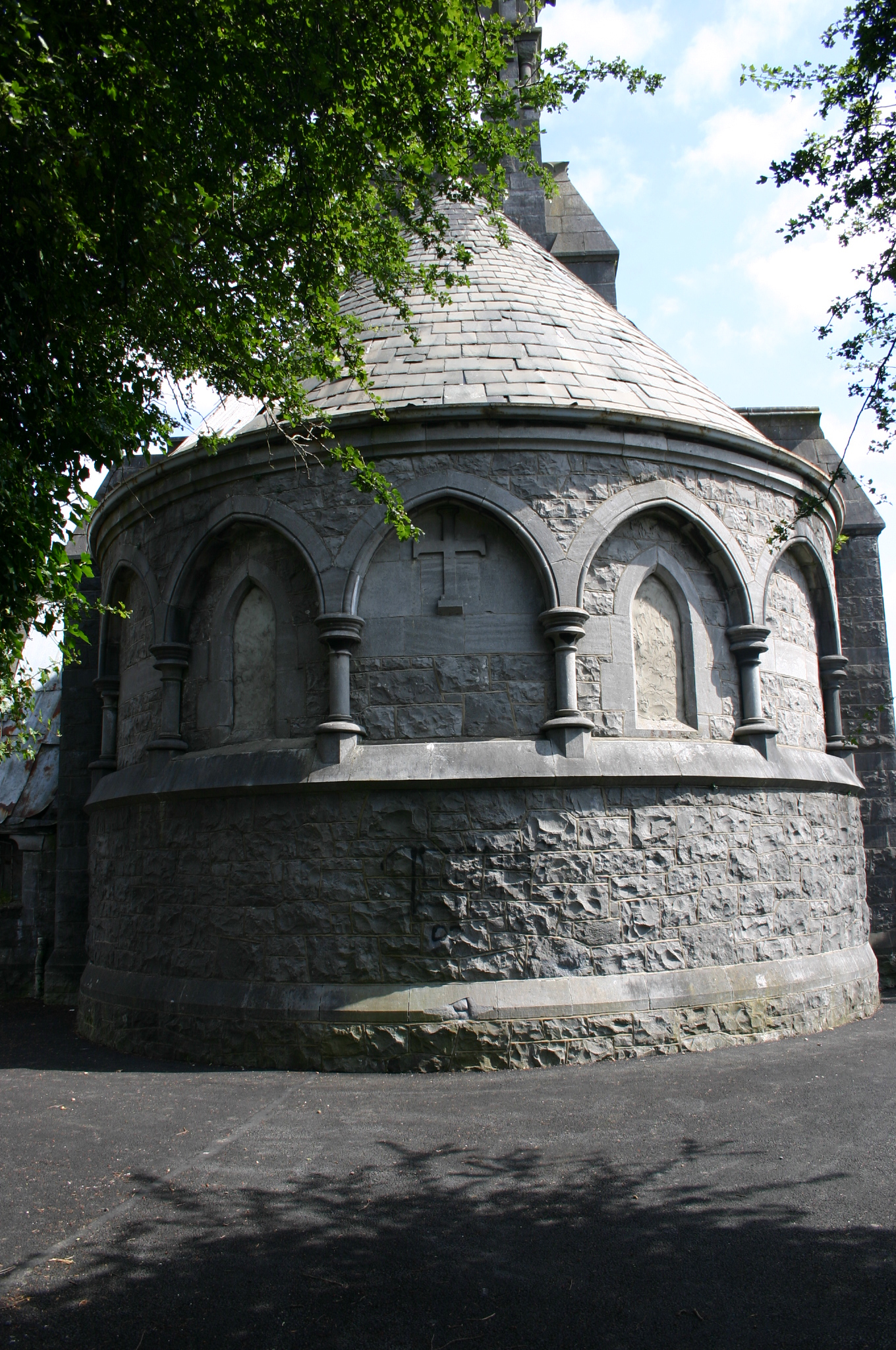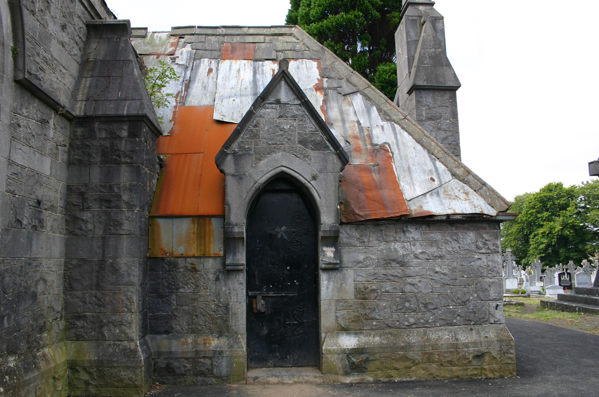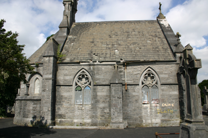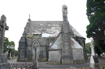 A Celtic Revival and Gothic Revival essay in design, this fine chapel is located at a pivotal axial position within Mount Saint Lawrence's cemetery terminating the vista of the principal avenue within, framed by copper beeches. It sets the solemn tone for the site, which is populated by some of the finest nineteenth-century funerary monuments in the city. With an uncertain future due to lack of effective maintenance and wanton vandalism, this fine jewel-like mortuary chapel is in need of urgent and immediate restoration.