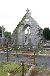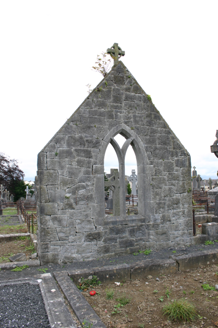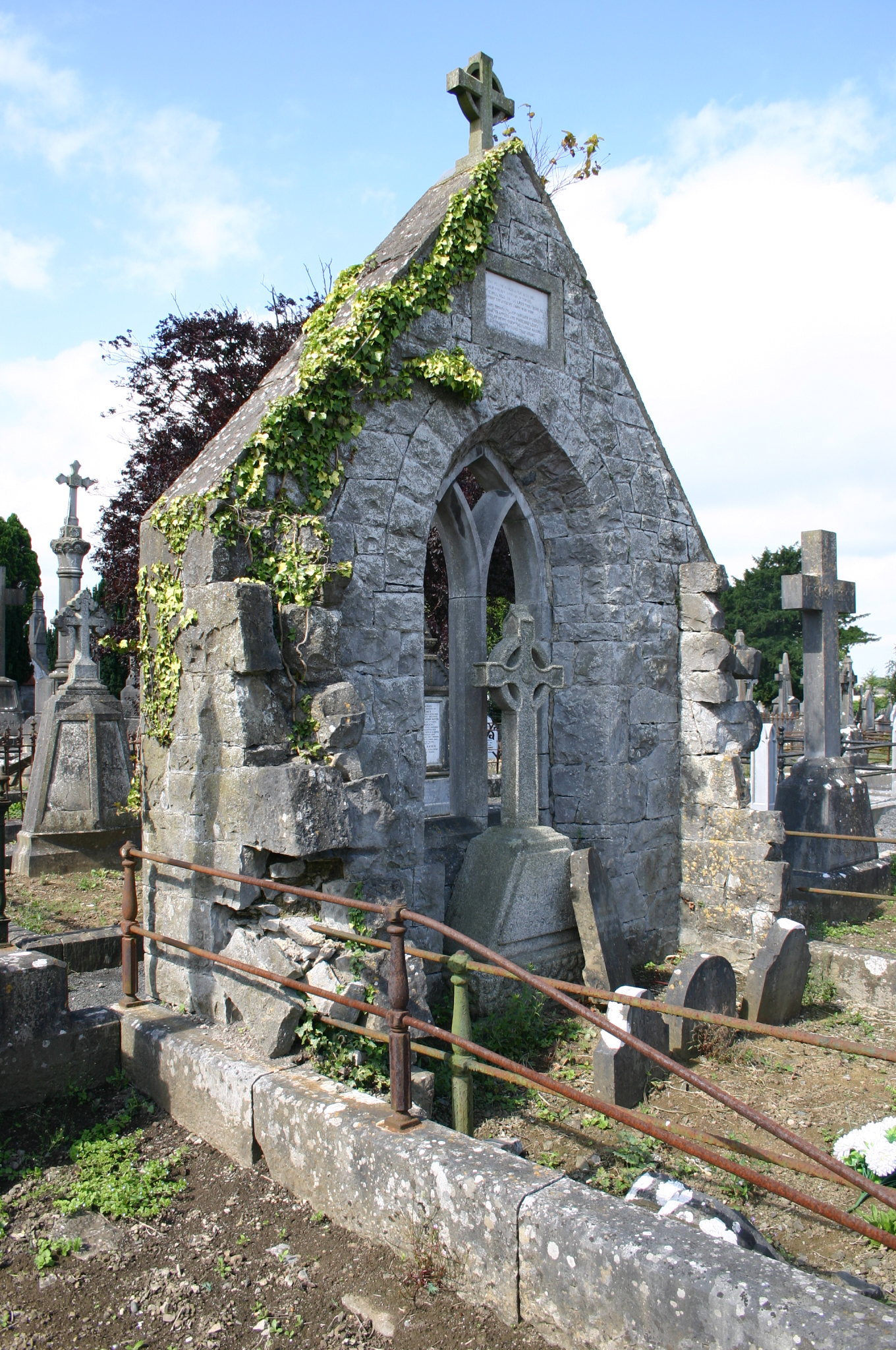 Detached limestone monument, erected c. 1890, as a faux church ruin. It forms one gabled elevation returning to form side elevations which give the appearance of having collapsed. Limestone Celtic cross surmounts gable punctured by a pointed arched window opening with plain limestone Y-tracery and splayed reveals. Plot demarcated by limestone plinth wall supporting cast-iron rail posts and wrought-iron horizontal rails. Multiple grave markers and Celtic cross grave marker within the plot. All this allegory is evoked in literary form on a marble plaque which reads: THE CELTIC CROSS RAISE OVER ME. AND THE IVY AROUND IT TWINE. IT WILL TELL TO THE LAND THAT BORE ME. THAT THE ANCIENT FAITH WAS MINE. AND THOUGH FALLEN AND LOW FOUND I. ALL TRAMPLED AND POOR AND LONE. YET MY HEART GREW THE CLOSER AROUND IT LIKE THE IVY AROUND THAT STONE.