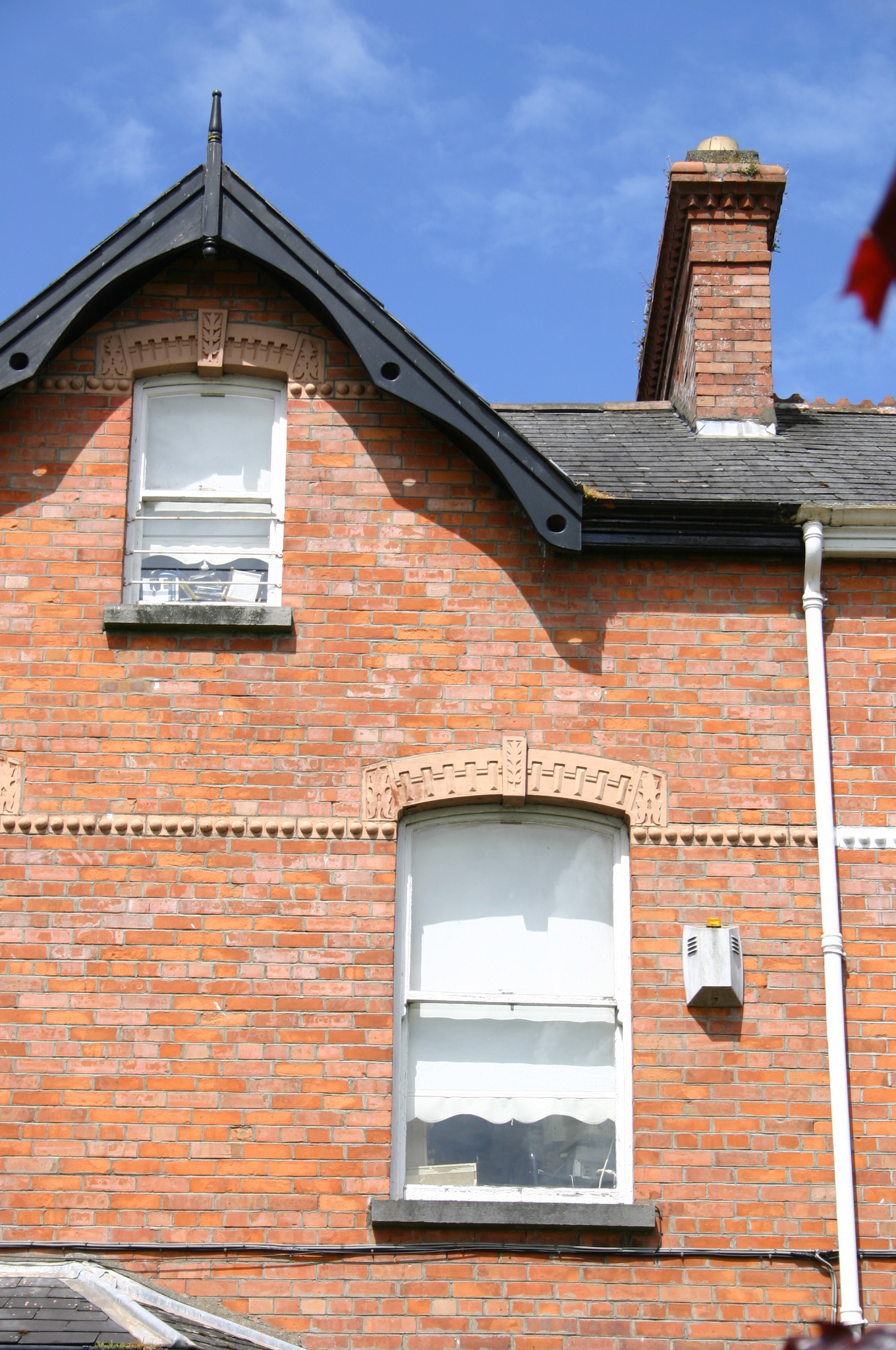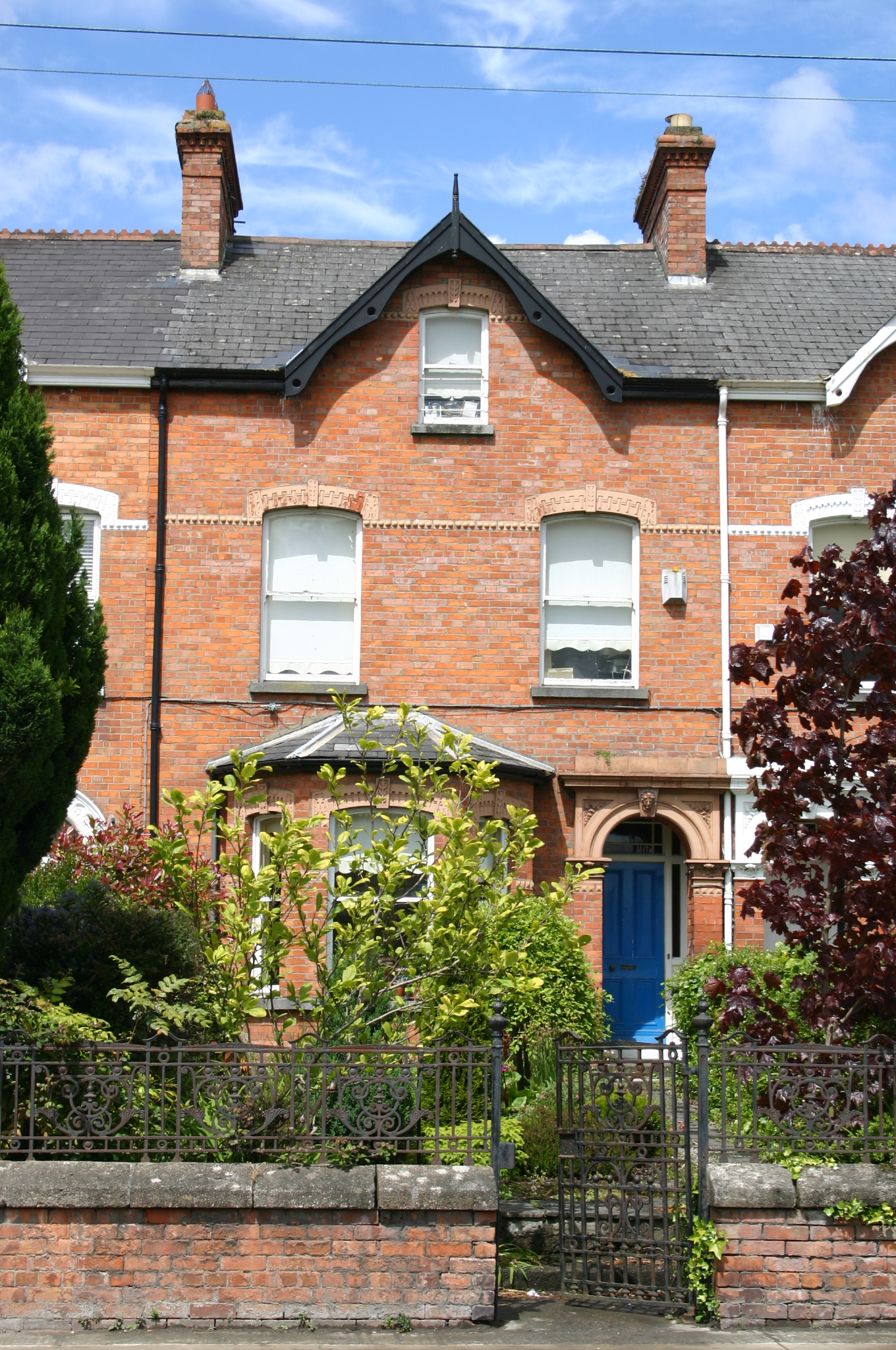 Terraced two-bay two-storey red brick house, built c. 1890, with a centrally-placed red brick half-dormer window flush with façade at second floor level, and a single-storey red brick three-sided canted bay window. Two-storey return to rear. Pitched artificial slate roof with plain terracotta ridge tiles. Decorative timber bargeboard and finial to apex of half-dormer. Red brick chimneystacks to party walls, each having a stretcher brick stringcourse and dog-tooth enriched cornice, and plain clay pots. Cast-iron rainwater goods. Red brick façade laid in English garden wall bond, with terracotta courses at springing of window arches at ground and first floor level wrapping around bay window, having a hemispherical-moulded detailing at first floor level and nail-head moulding at ground floor level. Rendered rear elevation. Segmental-arched window openings with pre-cast lintels having elaborate detailing and keystone, red brick reveals, limestone sills and one-over-one timber sash windows with some cylinder glass surviving. Round-arch porch door opening with red brick pilasters having cast terracotta capitals joined by over-door enriched by cast foliate spandrels and Bacchus mask to keystone beneath a cornice, which continues over opening of neighbouring house. Original timber doorframe comprising sidelights and margin-paned overlight with flat-panelled timber door. Site enclosed from the road by a red brick plinth wall with terminating red brick piers, having stop-chamfered corners, and painted capping stones. Cast-iron panelled railings to plinth wall cast-iron gate posts and cast-iron gate.