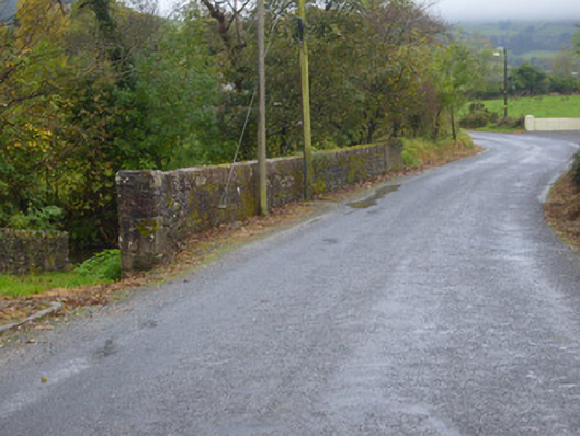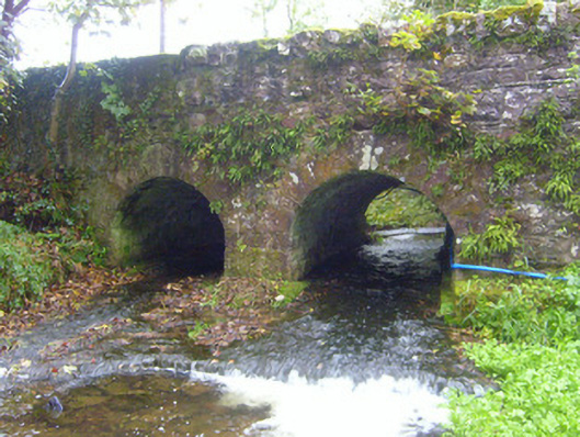 Double-arch roughly dressed sandstone road bridge over the River Keale, built c. 1800. Roughly dressed voussoirs to segmental-headed arches.