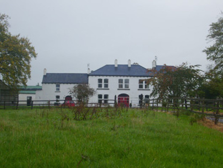 Detached three-bay two-story house, built c. 1870, with original house dating to c. 1820. Complex comprising two-bay two-storey recessed block to west and single-bay two-storey recessed block to east. Four-bay two-storey extension to rear (north) elevation having single-storey lean-tos. Hipped slate roof with rendered chimneystacks to main building and east block, pitched slate roof having rendered chimneystacks to west block and extension to rear. Rendered walls with plinth course. Paired camber-headed openings having painted stone sills and replacement uPVC windows. Segmental-headed opening with glazed overlight over timber panelled door having flanking sidelights with timber risers. Tiled threshold to entrance. Segmental-headed opening to west block with glazed overlight over timber panelled door with flanking side lights. Multiple-bay range of outbuildings to north set around a courtyard. Pitched corrugated-iron roofs. Square-headed openings with timber battened half-doors, some with glazed overlights.