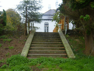 Detached six-bay two-storey Gothic Revival country house, built c. 1830, comprising two-bay two-storey gabled projection to front (south-east), lean-tos to front, south end bay, extension to south elevation, canted extension to north-east elevation and full-height bay window to rear (north-west) elevation. Hipped slate roofs having terracotta ridge tiles, ridge crestings, finials, rendered chimneystacks and timber bracketed eaves course. Rendered walls with render plinth course. Square-headed openings having chamfered surrounds and one-over-one pane timber sliding sash windows. Paired square-headed openings to gabled projection, first floor with render hoodmoulding with ornate stops. Pointed arch tripartite openings to gabled projection, ground floor having chamfered surrounds, carved limestone transoms with dog tooth motifs, one-over-one pane timber sliding sash windows and render hoodmoulding. Square-headed openings to north-east canted extension having ornate chamfered surrounds and stained glass windows. Square-headed paired openings to full-height bay window, rear elevation with chamfered surrounds, carved limestone transoms having dog tooth motifs and one-over-one pane timber sliding sash windows. Pointed arch opening to front having glazed overlight, painted stone transom with dog tooth motifs, flanking Corinthian style marble columns with render caps and glazed overlight over timber panelled double-leaf doors. Limestone steps to entrance. Square-headed opening to north-east canted bay having chamfered surround, stained glass overlight with limestone transom having dog tooth motifs over double-leaf half-glazed timber panelled doors. Rendered steps to entrance. Flight of limestone steps with chamfered limestone copings to north-west. Range of outbuildings to south. Nine-bay two-storey north-east range comprising gabled breakfront with open-work limestone bellcote having cast-iron weathervane and projecting gabled end bays. Pitched slate roofs. Rubble sandstone walls with brick quoins. Round-headed openings to first floor with brick surrounds, limestone sills and replacement uPVC windows. Segmental-headed openings to ground floor having limestone block-and-start surrounds, sills and replacement uPVC windows. Limestone entablatures to recessed blocks, ground floor windows. Elliptical-headed carriage arches to gabled end bays with rusticated limestone surrounds, having inset square-headed window openings. Elliptical-headed carriage arch to breakfront with rusticated voussoirs and ashlar piers. Multiple-bay two-storey ranges having pitched slate roofs. Rubble sandstone walls. Segmental-headed openings with limestone block-and-start surrounds and uPVC windows. Segmental-headed openings with timber battened doors. Pair of square-profile rendered piers with sweeping walls terminating in second pair of piers.