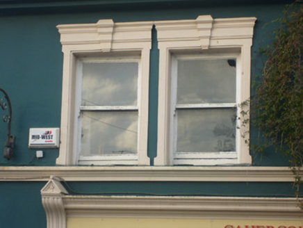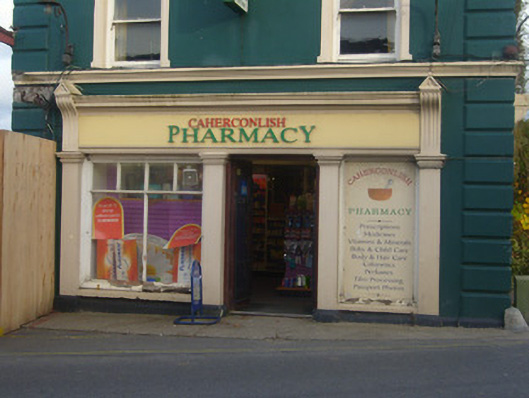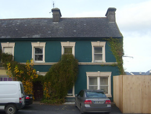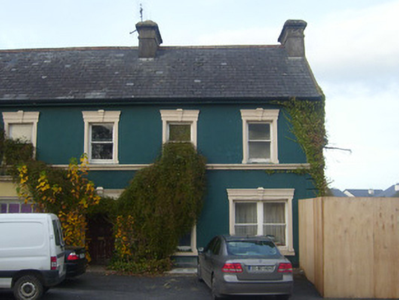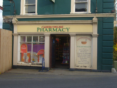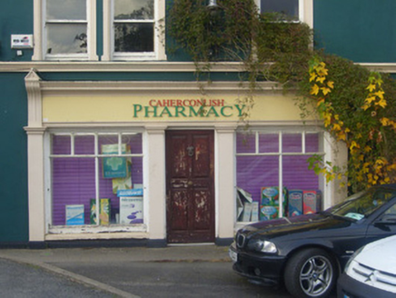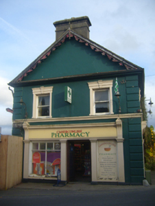 Semi-detached six-bay two-storey house, built c. 1800, having render shopfronts to west and south elevations. Now in use as a pharmacy. Pitched slate roof with cast-iron rainwater goods, rendered chimneystacks, terracotta ridge tiles, finials and timber bargeboards. Rendered walls having render quoins and stringcourse. Square-headed openings to first floor with render surrounds having architraves with keystones and one-over-one pane timber sliding sash windows. Square-headed opening to ground floor having render surround with architrave, keystone, concrete sill and bipartite one-over-one pane timber sliding sash windows. Shopfront to west comprising render Doric style pilasters, fluted consoles with pedimented caps, fascia and moulded cornice. Square-headed display windows, some with fixed timber windows. Square-headed opening having half-glazed timber panelled double doors. Shopfront to south comprising render Doric style pilasters, fluted consoles with pedimented caps, fascia and moulded cornice. Square-headed display windows having fixed timber windows. Square-headed opening with timber panelled door. Square-headed opening having render surround with architrave, keystone and timber panelled door.