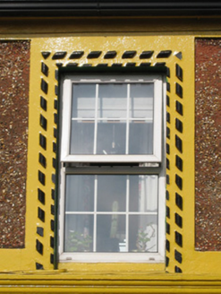 The variety of render on this buidling adds textural interest to the streetscape. Of similar size and scale to surrounding structures, the house maintains the roofline of the street. The end chimneystacks add symmetry to the façade, as also articulated by the render detailing. The chimneystacks contribute too to the decorative emphasis of the structure. The double shopfront is unusual, comprising the entire width of the ground floor, making a strong impression on the Cappamore streetscape.