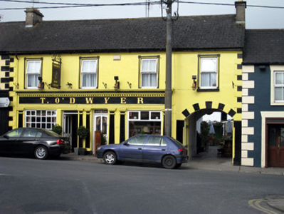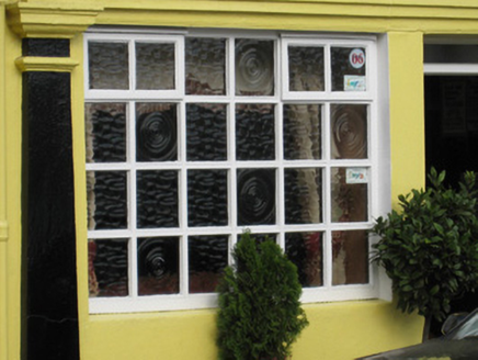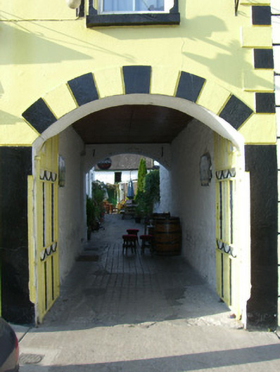 Attached four-bay two-storey house, built c. 1820, with integral carriage arch and pubfront to front (south) elevation. Multiple-bay two-storey pitched-roofed block at right angles to rear (north) with recent extension to north gable. Now also in use as pub. Pitched slate roof with rendered chimneystacks, moulded render eaves course and cast-iron rainwater goods. Rendered walls with render quoins. Square-headed openings with decorative render surrounds and replacement windows. Timber shopfront comprising pilasters flanking openings, paired to central bay with, architrave, fascia with raised lettering and dentilated cornice. Square-headed openings, one having multiple pane timber window, one having fixed timber window with overlights. Square-headed openings with timber panelled half-glazed doors. Segmental-headed carriage arch with render voussoir details and flanking chamfered render pilasters. Cast-iron double-leaf gates. Four-bay two-storey outbuilding to rear with pitched slate roof, timber eaves course, painted rubble stone walls and square-headed openings, those to the ground floor with timber doors. Lean-to four-bay single-storey outbuilding to west with single-pitched corrugated-iron roof, timber eaves course, rendered walls, square-headed opening with timber battened doors.