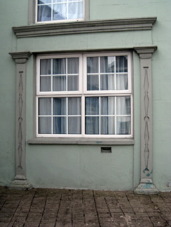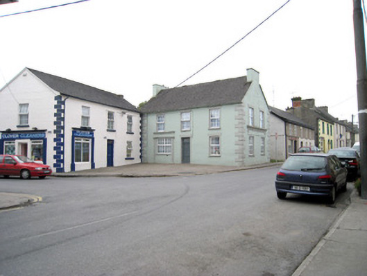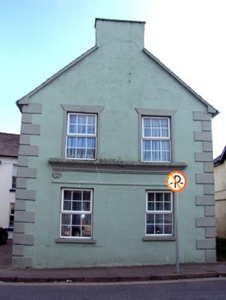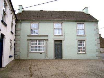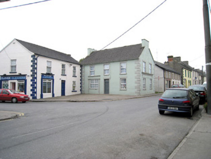 Attached three-bay two-storey house, built c. 1820, with render shopfronts to front (east) and north elevations. Formerly in use as shop. Pitched slate roof with rendered chimneystacks, render copings to gables and cast-iron rainwater goods. Lined-and-ruled rendered walls with render quoins. Square-headed openings with replacement uPVC windows render sill and render surrounds, with incised circular motifs. Square-headed door opening with timber panelled door, overlight, timber architrave and render surround with incised circular motif. Shopfront to front elevation comprising render pilasters flanking opening with ornate recessed panel, caps and plinths, fascia and cornice. Square-headed opening with replacement uPVC windows. Shopfront to north elevation comprising render architrave, fascia with render motif in relief to ends and decorative render cornice with circular motifs.