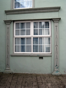 This building occupies a prominent site at a junction and at right angles to the neighbouring building, thus forming an open space to the front. The façade is articulated by render quoins. Emphasis is placed on the decorative elements, such as the heavy corniced shopfronts with their unusual patterning. The building retains a notable early door as well as much of its original form.