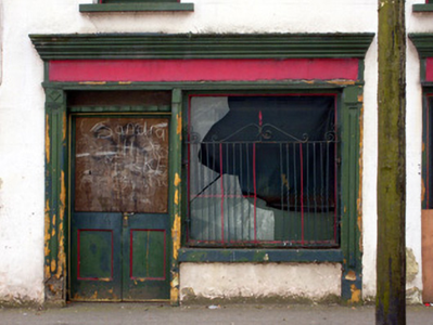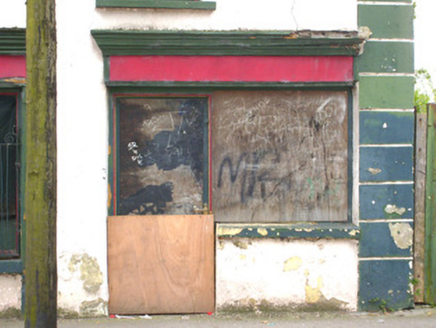 Attached three-bay two-storey house, built c. 1820, with pair of shopfronts to ground floor front elevation. Formerly in use as shop. Pitched slate roof with rendered chimneystacks and render coping to gable. Lined-and-ruled rendered walls with render quoins. Square-headed openings with one-over-one pane timber sliding sash windows and render keystone details. Square-headed opening to ground floor with timber panelled door, overlight, decorative timber door surround and render label moulding. Shopfront to west bay comprising timber fascia and cornice, square-headed openings now infilled. Shopfront to central bay comprising timber pilasters with decorative panels and motifs flanking openings with timber fascia and cornice. Square-headed opening with concrete sill and wrought-iron sill guard. Square-headed opening with timber panelled double-leaf door.