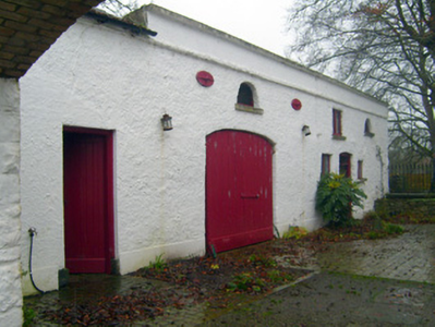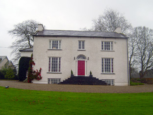 Detached three-bay two-storey over basement house, built c. 1830, having two-bay two-storey extension to rear (south) elevation. Pitched slate roof with rendered chimneystacks, render eaves course and copings. Hipped slate roof to extension. Roughcast rendered walls having rendered walls to basement. Square-headed openings with limestone sills and tripartite three-over-six pane timber sliding sash windows to first floor having flanking one-over-two pane timber sliding sash windows. Those to ground floor with six-over-nine pane timber sliding sash windows and flanking two-over-three pane timber sliding sash windows. Square-headed opening to centre-bay first floor having limestone sill and casement window. Square-headed openings to basement having tripartite six-over-six pane timber sliding sash windows with flanking two-over-two pane timber sliding sash windows having cast-iron sill guards and limestone sills. Round-headed opening with cobweb fanlight over timber panelled door having flanking Ionic columns. Flight of limestone steps to entrance. Elliptical-headed carriage arch to east with limestone copings. Five-bay two-storey outbuilding to south with half-hipped slate roof, rendered parapet and red brick chimneystack. Roughcast rendered walls having cast-iron ties. Round-headed window openings to first floor with limestone sills. Square-headed opening to first floor having casement windows and limestone sills. Square-headed openings to ground floor with casement windows and limestone sills. Square-headed openings having timber battened doors. Elliptical-headed carriage arch with double-leaf timber battened doors. Pair of square-profile monolith limestone piers to north having carved caps, double-leaf spear-headed cast-iron gates and rubble boundary walls with limestone copings.