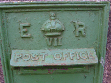 Wall-mounted cast-iron post box, c. 1905, with inscribed ER VII and raised crown motif. Set in limestone wall. Manufactured by 'W.T. Allen & Co. London.'