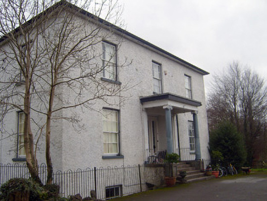 Detached three-bay two-storey over basement house, built c. 1800, having portico to front (north) elevation. Hipped slate roof with rendered chimneystacks, overhanging eaves and cast-iron rainwater goods. Roughcast rendered walls. Square-headed openings having limestone sills and six-over-six pane timber sliding sash windows. Portico comprising rendered Ionic style columns with limestone plinths supporting entablature and cornice over square-headed opening having double-leaf half-glazed timber panelled doors, sidelights with timber risers and flanking Doric style pilasters. Flight of limestone steps to entrance. Square-headed opening to rear (south) elevation having glazed overlight over half-glazed timber battened door. Metal railings to basement north, east and west elevations. Pair of square-profile brick piers to north with render caps, double-leaf cast-iron gates and rendered sweeping walls having cast-iron railings terminating in second pair of brick piers.