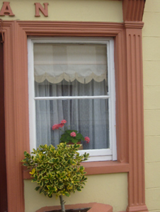 The hipped slated roof and lined-and-ruled walls are features typical of houses of this type. The render details including alternating quoins, window surrounds and shopfront enliven the regular façade.