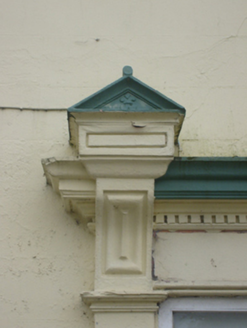 End-of-terrace four-bay two-storey house, built c. 1820, having render shopfront to front (east) elevation and single-storey extension to rear (west) elevation. Pitched slate roof with rendered chimneystacks and cast-iron rain water goods. Lined-and-ruled rendered walls having render plinth course and quoins. Square-headed openings to first floor with render surrounds having entablatures with recessed tiled panels and one-over-one pane timber sliding sash windows to first floor. Shopfront comprising render pilasters having tiled panels supporting ornate pedimented consoles, fascia with raised lettering and dentillated cornice. Square-headed display windows. Square-headed openings having glazed overlights over double-leaf timber panelled doors.