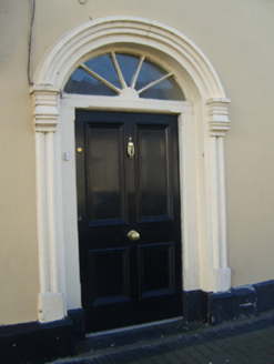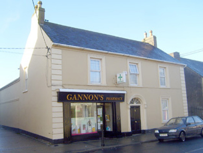 Detached three-bay two-storey house, built c. 1890, with shopfront to front (east) elevation. Pitched slate roof having rendered chimneystacks and render eaves course. Rendered walls with render strip quoins and plinth course. Rubble stone walls to north elevation. Square-headed openings having concrete sills, render surrounds and replacement uPVC windows. Those to first floor with continuous render sill course. Round-headed opening having fluted render pilasters and hoodmoulding over spoked fanlight and timber panelled door. Shopfront comprising timber pilasters supporting fascia. Square-headed display opening with fixed window. Recessed square-headed opening having half-glazed timber panelled door.