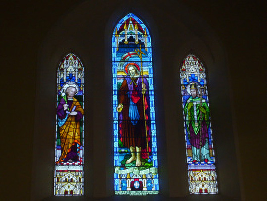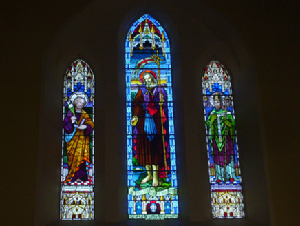 Freestanding cruciform-plan gable-fronted Roman Catholic church, built in 1852. Comprising three-bay double-height nave, recent porch to front (east) elevation, recent porches to transepts, north and south elevations and gable-fronted three-bay single-storey sacristy to rear (west) elevation. Pitched slate roof with cast-iron rainwater goods and timber bargeboards. Snecked limestone walls having cut limestone quoins, plinth course and buttresses. Inscribed limestone plaques to front elevation and sacristy, north elevation. Blind roundels to transept apexes having inset quatrefoil motifs. Pointed arch opening front elevation, gable apex with limestone hoodmoulding and inset trefoil stained glass window. Pointed arch opening to front having limestone hoodmoulding and limestone traceried stained glass windows. Pointed arch openings to nave and transepts, east elevation with tooled limestone surrounds, continuous sill course and timber Y-tracery stained glass windows. Limestone trefoil-headed holy water fonts to transept windows with carved cross motifs. Triple lancet stained glass windows to transepts, north and south elevations having continuous limestone hoodmoulding, ornate stops and relieving arches. Pointed arch opening to chancel with limestone hoodmoulding, chamfered surround and stained glass window. Pointed arch openings to sacristy, north elevation having cut limestone voussoirs and stained glass windows. Pointed arch opening to north elevation with chamfered limestone surround having inset trefoil-headed holy water font, now blocked up. Square-headed openings to porch with timber battened doors. Pointed arch opening to front elevation, obscured by porch, having limestone hoodmoulding and chamfered surround with inset trefoil-headed holy water fonts. Pointed arch opening to sacristy, north elevation having cut limestone voussoirs and timber battened door. Flight of concrete steps with metal railings to entrance. Scissors truss timber roof having painted stone corbels. Painted timber gallery to east with inset trefoil-headed panels. Ruined church to site. Graveyard to site. Recent brick boundary walls to site having square-profile piers with double-leaf metal gates.