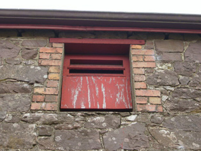 Detached irregular-plan three-bay two-storey presbytery, built c. 1880. Having turret to first floor and bay window to front (east) elevation. Two-bay two-storey extension to rear (west) elevation. Hipped slate roof with cast-iron rainwater goods, brick chimneystacks having limestone cornices and double-banded red and yellow brick eaves course. Lead roof to turret. Pitched slate roof to rear extension. Snecked rusticated sandstone walls having yellow brick quoins and limestone stringcourse. Buttress to front with limestone dressings. Square-headed bipartite and tripartite openings with tooled limestone surrounds, mullions, sills and one-over-one pane timber sliding sash windows throughout. Yellow brick relieving arch over first floor tripartite window having herringbone brick coursing. Square-headed window openings to turret with tooled limestone surrounds and sills. Paired camber-headed window openings to rear extension having red brick block-and-start surrounds and limestone sills. Pointed arch opening having yellow brick surround, hoodmoulding and limestone impost course with carved stops over Y-tracery glazed overlight and timber panelled door. Eight-bay two-storey outbuilding to south-west having pitched slate roof. Roughly-dressed sandstone walls with tooled limestone quoins. Camber-headed openings to ground floor with red brick block-and-start surrounds, two-over-two pane timber sliding sash windows and concrete sills. Square-headed openings to first floor having brick block-and-start surrounds and timber fittings. Camber-headed openings with red brick block-and-start surrounds and timber battened half-doors. Square-headed carriage arch having red brick block-and-start surround and replacement metal door. Pair of rusticated limestone square-profile piers to east with carved caps and double-leaf cast-iron gates. Rubble and snecked sandstone walls having render copings and cast-iron railings. Pair of cut limestone square-profile piers to west with crenellated caps and double-leaf metal gates. Rubble sandstone boundary walls to site.