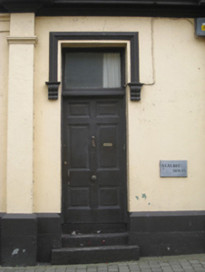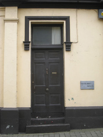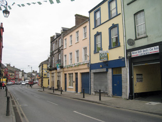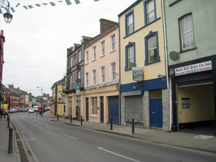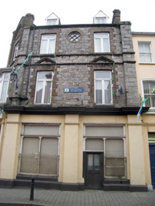 End-of-terrace corner-sited two-bay three-storey with dormer attic house, built c. 1830, having chamfered entrance bay to north elevation with brick pediment, canted oriel window to first floor, and two-bay single-storey extension to south elevation. Pitched slate roof with brick chimneystacks. Dressed limestone walls to first and second floors, with limestone strip quoins and brick stringcourse. Rendered walls to ground floor having render pilasters, plinth course and moulded render cornice. Square-headed openings to dormer attic with replacement uPVC windows. Square-headed openings to second floor with brick block-and-start surrounds, limestone sills and replacement uPVC windows. Oculus to second floor, north-east elevation having brick surround and quarry glazed window. Square-headed openings to first floor with brick pediments, block-and-start surrounds, limestone sills and replacement uPVC windows. Square-headed openings to oriel having replacement uPVC windows. Square-headed display openings with glazed overlights over bipartite fixed glazed windows having cast-iron sill guards. Square-headed opening to chamfered corner with glazed overlight over double-leaf timber panelled doors. Square-headed opening to west elevation having render hoodmoulding with ornate stops and glazed overlight over timber panelled door.