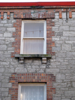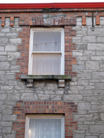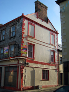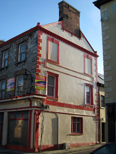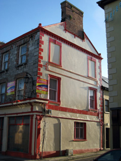 Terraced seven-bay three-storey house, built in 1871, with render shopfront to front (north-east) elevation. Pitched slate roof having brick chimneystacks, eaves course and cast-iron rainwater goods. Roughly dressed limestone walls and cut limestone quoins. Rendered walls to west elevation with render surround to chimney flue, copings having ball finials, bracketed cornice, quoins, plinth course and fascia. Square-headed openings with limestone sills, brackets, brick block-and-start surrounds and one-over-one pane timber sliding sash windows. Those to second floor having rusticated limestone keystones. Shopfront comprising, render Ionic style pilasters, fascia, dentillated and bracketed cornice having animal head motifs. Square-headed display opening to west end bay with timber casement windows. Display window to east end bay having flanking render consoles, pilasters and voussoirs with inscribed keystone, two-over-two pane timber sliding sash window and concrete sill having cast-iron sill guard. Square-headed opening with glazed overlight over replacement half-glazed timber panelled door. Square-headed opening having render roll moulded jambs, ornate pilasters and festoon motif over shouldered glazed overlight over timber panelled door. Square-headed opening having shouldered glazed overlight with flanking scrolled and foliate consoles over timber panelled door. Square-headed carriage arch having render quoins and single-leaf metal gate.