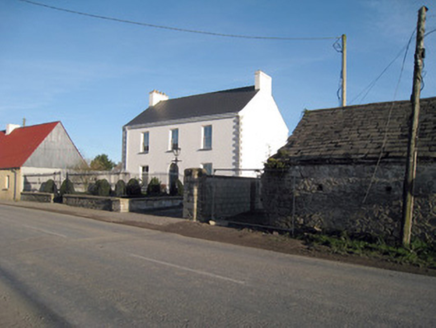 Detached three-bay two-storey house, built c. 1850, with recent extensions to rear. Pitched artificial slate roof having rendered chimneystacks. Rendered walls with limestone plinth course and quoins. Square-headed openings having two-over-two pane timber sliding sash windows and limestone sills. Round-headed opening to rear with replacement uPVC window. Round-headed opening having spoked fanlight over timber panelled door with flanking fluted timber pilasters. Limestone threshold to entrance. Six-bay single-storey outbuilding to south having pitched slate roof and cast-iron rainwater goods. Rubble limestone walls. Square-headed door openings with replacement fittings. Pair of square-profile cast-iron piers having double-leaf cast-iron gates and limestone boundary walls with spear-headed cast-iron railings.