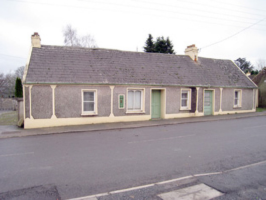 Detached six-bay single-storey house, built c. 1880, having shopfront to front (west) elevation. Pitched slate roof with rendered chimneystacks and cast-iron rainwater goods. Roughcast rendered walls having cast-iron post box, render strip quoins, pilasters and plinth course. Square-headed openings with one-over-one pane timber sliding sash windows, render surrounds and painted stone sills. Recessed square-headed openings having timber panelled door and half-glazed timber panelled door. Shopfront comprising square-headed display opening with camber-headed bipartite fixed window.