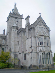 Adare Manor is an impressive pile, which displays elements informed by a mix of influences and styles, with Tudor Revival style being the most prominent. The house is composed of various elements that are loosely tied together. It has a long and distinguished architectural history, which began in 1832 with the rebuilding, enlarging and subsequent demolition of the earlier eighteenth-century manor house of the Quin family. The initial plans for the house were supplied by James and George Richard Pain. Their services, however, were dispensed with in c. 1838 and the then Lord Dunraven continued with the design of the house himself with help from the English architect Lewis Nockalls Cottingham. The initial phase of construction was completed under the control of master mason, James Connolly, together with the second Earl of Dunraven and his wife, Caroline Wyndham, who incorporated their favourite buildings into the design - the Cloister Court at Eton being a significant influence. A.W.N. Pugin was employed in 1846 to design some of the interior features including the great hall. The three-storey southern range and the tower with pyramidal roof, completed between 1850 and 1862, by the third Earl of Dunraven were to the designs of P.C. Hardwick. The various building phases and styles mesh together to form an immensely impressive building. The highly decorative exterior incorporating fine stone crafting particularly in the oriel and mullioned windows, door surrounds, frieze and parapet. The interior features of the building are as impressive as the exterior, incorporating seventeenth-century Flemish choir stalls, excellent wood carving and stone crafted fireplaces and door surrounds. The text carved into the front of the south-facing parapet reads: 'Except the Lord build the house, that Labour is but lost that built it.'
