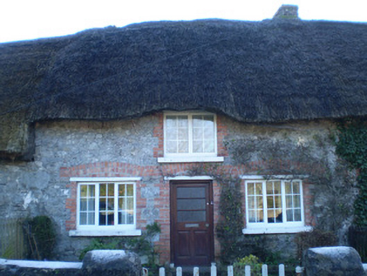 Terraced three-bay two-storey thatched house, built c. 1830. Pitched thatched roof, overhanging and with red brick chimneystack. Rubble stone walls. Square-headed openings with replacement casement windows, timber lintels and red brick block-and-start surrounds and relieving arches. Square-headed opening with timber panelled half-glazed door, red brick block-and-start surround and relieving arch. Rubble stone boundary wall with square-profile barrelled piers and cast-iron gate.