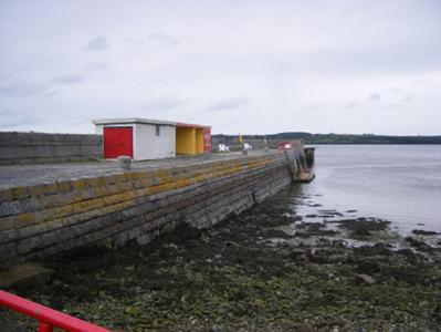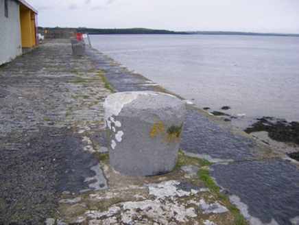 Battered limestone pier, built c. 1850. Coursed rusticated walling, with tooled limestone parapet walls to west. Limestone cobblestones and concrete surface to pier. Carved limestone mooring posts to east. Cast-iron framework jetty to north having cast-iron braces.