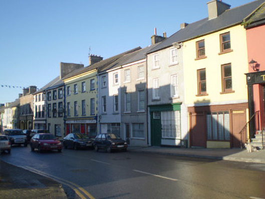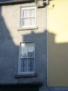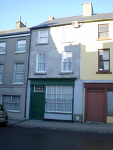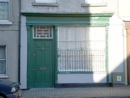 Attached two-bay three-storey house, built c. 1820, formerly in use as shop and having shopfront to ground floor, south (front) elevation. Pitched slate roof with rendered chimneystack. Roughcast rendered walls. Square-headed openings with render surrounds and two-over-two pane timber sliding sash windows. Shopfront comprising timber pilasters flanking openings, supporting architrave, fascia and cornice. Square-headed opening with fixed timber multiple pane window having cast-iron sill guard. Square-headed opening with timber panelled door with multiple pane coloured glass overlight.