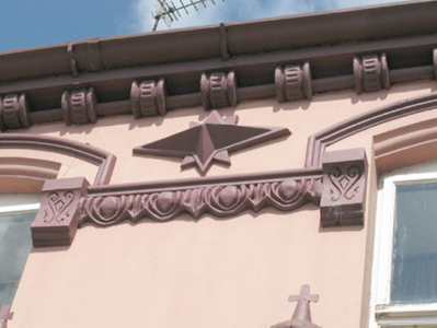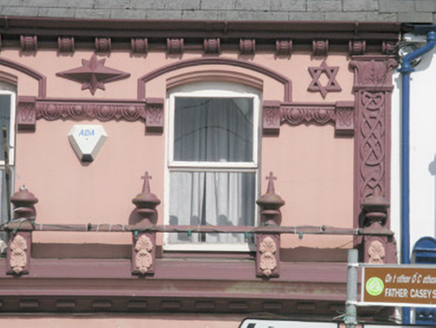 This modestly scaled building, former O'Mara's public house, is an important asset to Abbeyfeale. It is a particularly fine example of spectacular stucco work carried out by the Listowel artisan builder Pat McAuliffe (1846-1921). Influenced by the contemporary Classical Revival, stucco was an elaborate form of plaster work which imitated cut stone, best exemplified here by the render egg and dart stringcourses, decorative corbels, stars and an elaborate balustrade. Mixed in with the classical details are further styles including Celtic interlacing and mid-Eastern Byzantine style urns, to create a unique and very striking design that attests to the individual skill of the craftsman. Overflowing with detail, further attention is given to the windows with moulded arches pair with hoodmouldings flanked by corbels further enhancing this remarkable façade.