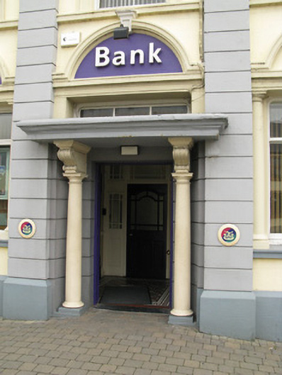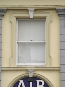 This commanding building, situated in a prominent position, displays numerous neo-classical influences including an impressive cornice, frieze, substantial pilasters and elaborate capitals that are typically found on many late nineteenth-century financial buildings. The contrasting styles of window openings with classically influenced Doric columns and an immense door case affirm the grandeur of this impressive building. The retention of historic sash windows aid in maintaining its historic character.