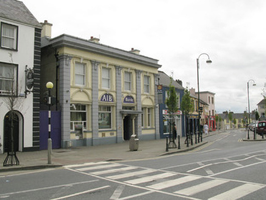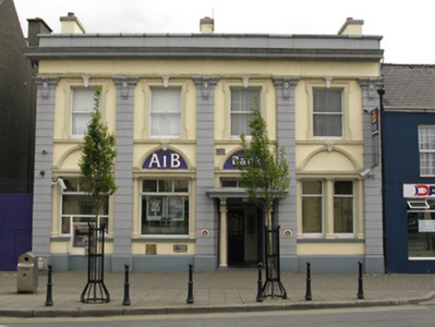 Attached four-bay two-storey bank, built c. 1870, having additional block to rear (south). Pitched slate roof with rendered chimneystacks and concealed gutters, behind rendered parapet wall to front (north) and northern end of side (east and west) elevations. Moulded render cornice to eaves, having metal-clad coping and cast-iron downpipes. Lined-and-ruled rendered walls with plinth, having rendered frieze and architrave below eaves. Channelled render pilasters, having scrolled triglyph decoration to capitals with acanthus motifs. Render sill course to first floor. Roughcast rendered walls to side (east) elevation. Square-headed window openings throughout, having moulded render surrounds, panelled keystones and one-over-one pane timber sliding sash windows to first floor. Render sills and architraves to ground floor window openings, having flanking engaged Doric columns to replacement fixed single-pane timber-framed display windows with tripartite overlights. Surmounted by round-headed render hoodmouldings with keystones, encompassing unadorned tympana with recent raised lettering. Paired one-over-one pane timber sliding sash windows to western bay. Recessed square-headed door opening with splayed reveals, accommodating render Doric columns and double-leaf timber panelled doors giving access to internal porch with decorative tiled threshold. Columns surmounted by scrolled render consoles supporting moulded canopy and tripartite overlight. Moulded render hoodmoulding with keystone, encompassing unadorned tympanum with recent raised lettering. Located overlooking Main Street.